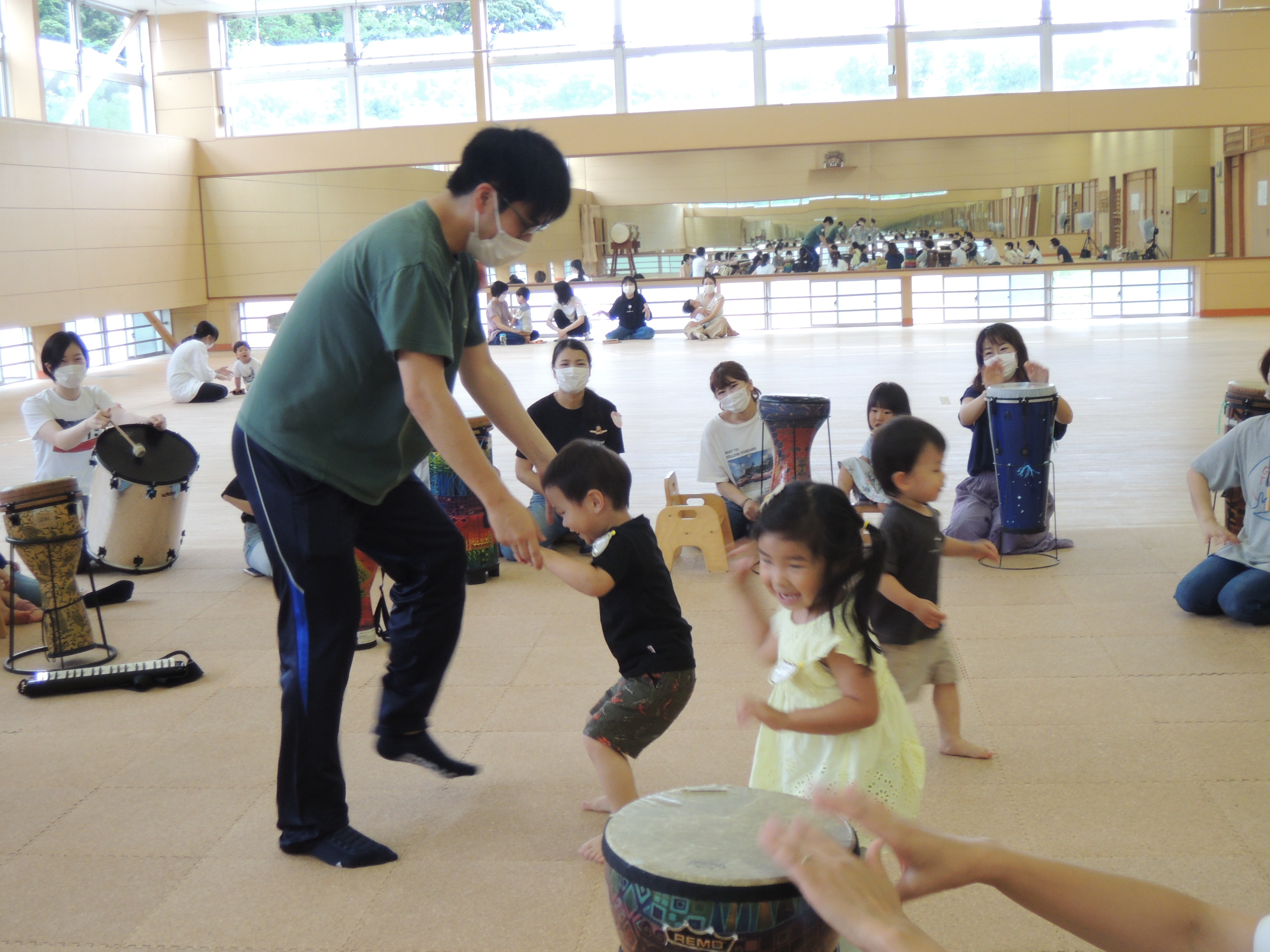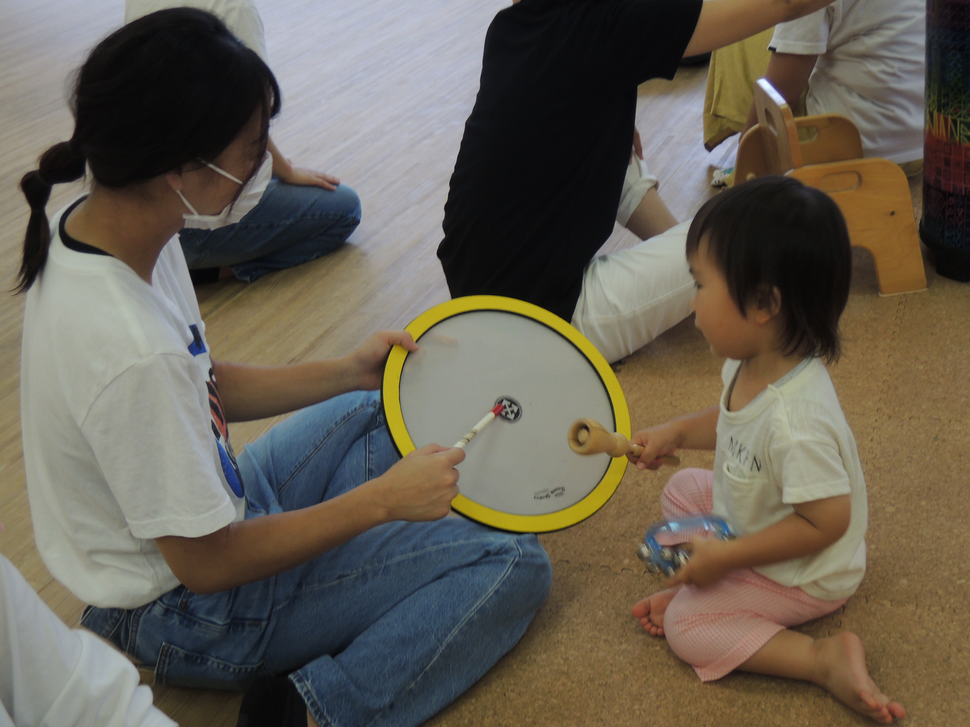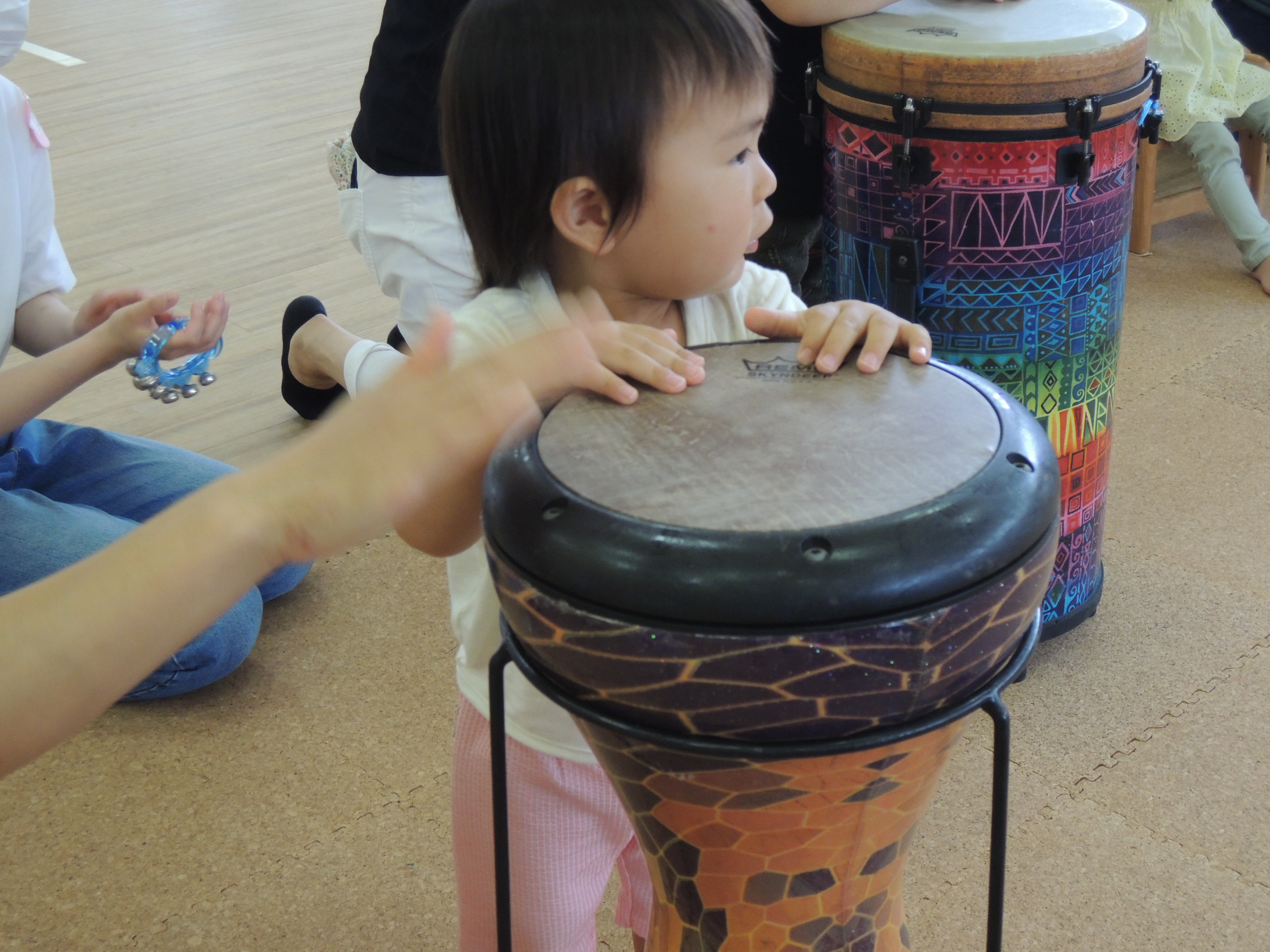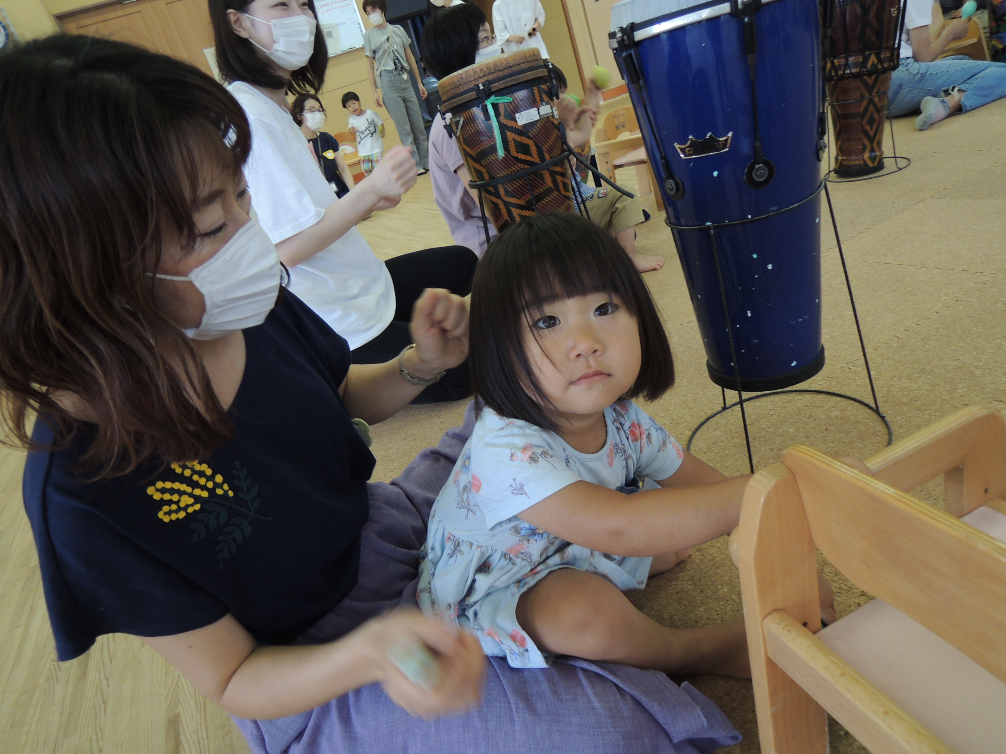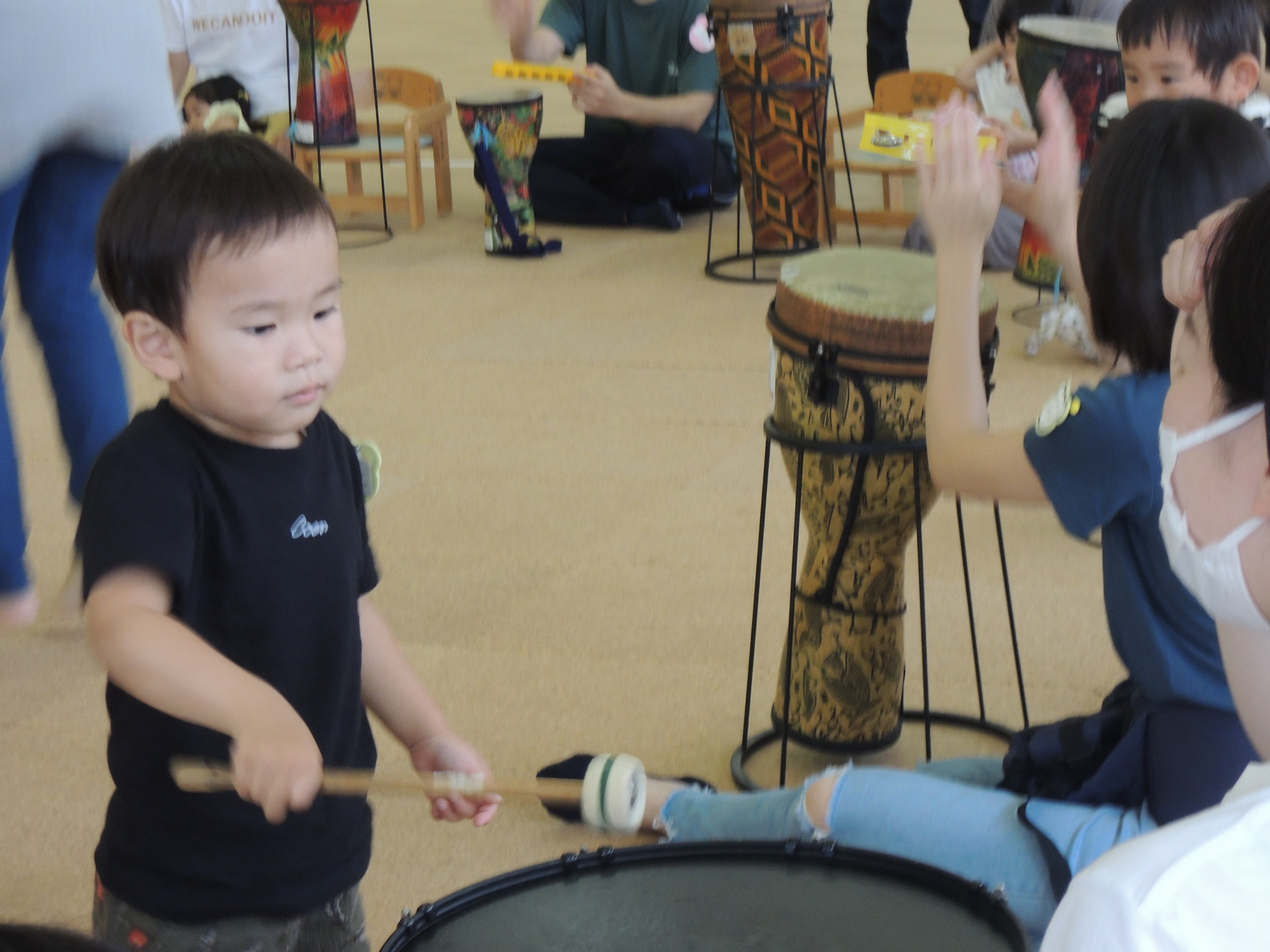 ちょっと音色が違うのに興味をもったのか、ベースに使っている大きめの太鼓を、真剣に叩き始めました。暫く真剣に叩いていましたが、気が済んだのか、いつの間にか安心するお母さまの膝に戻っていきました。