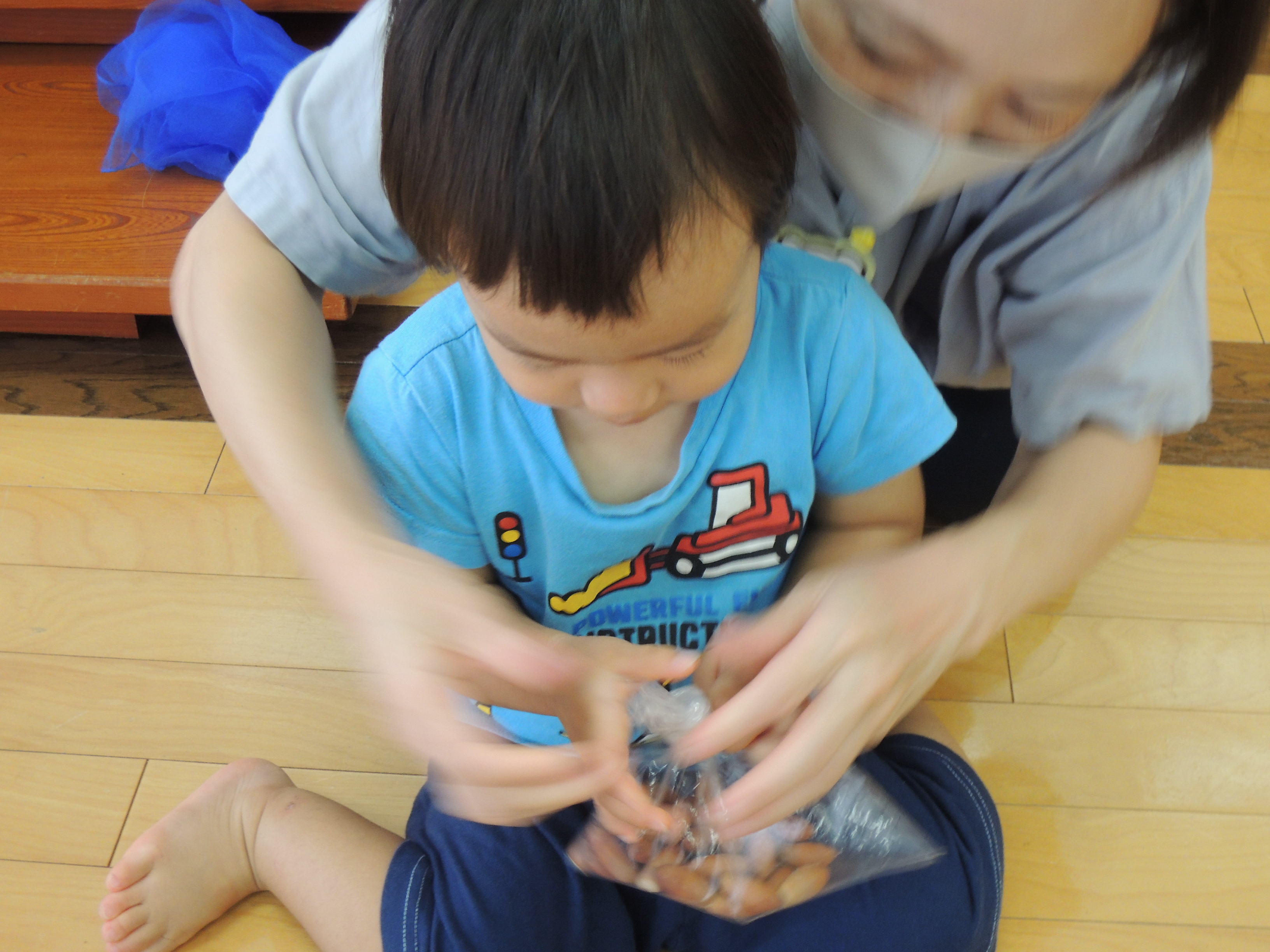 袋にどんぐりを入れて、どんぐり風船。 振って鳴らして落としてみて・・・♪