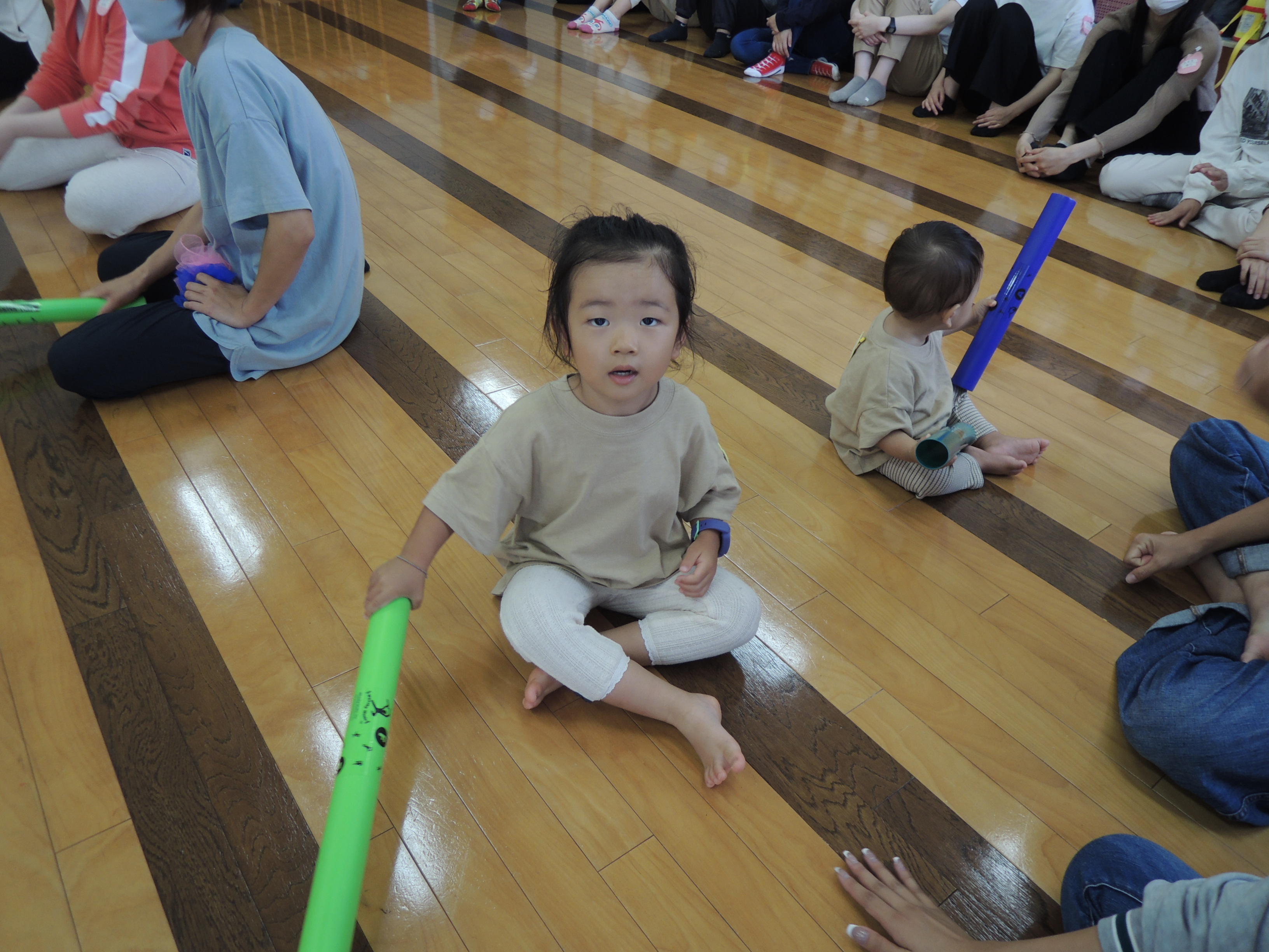 床や身体にポンとあてれば音が鳴るブームワッカーで、「おおきな栗の~♪」皆で音を感じ、楽しみました。
