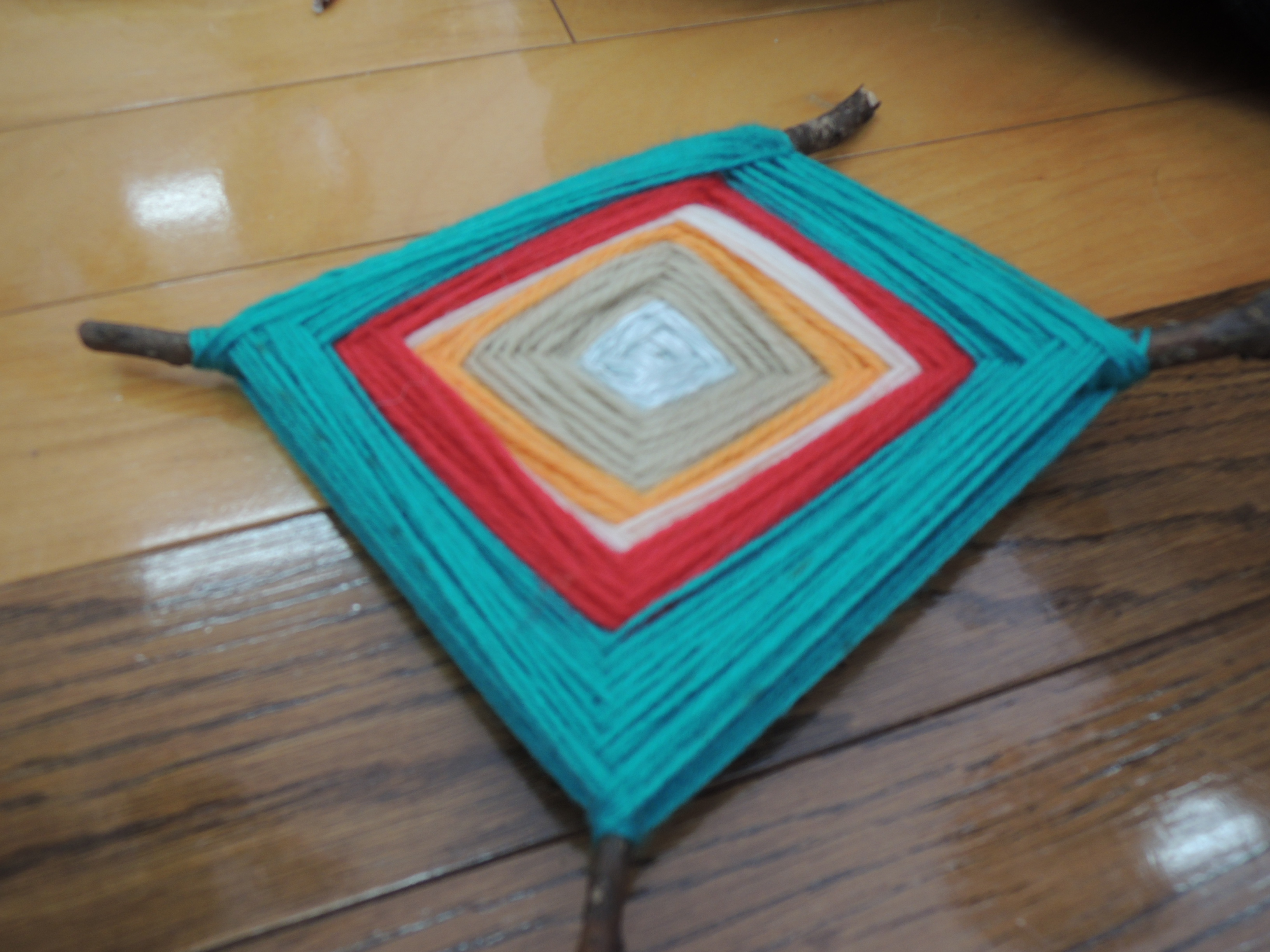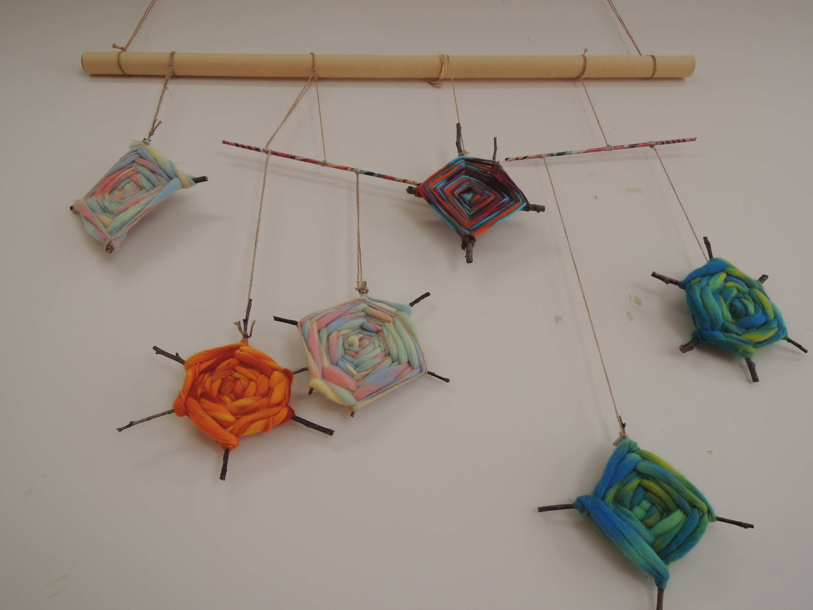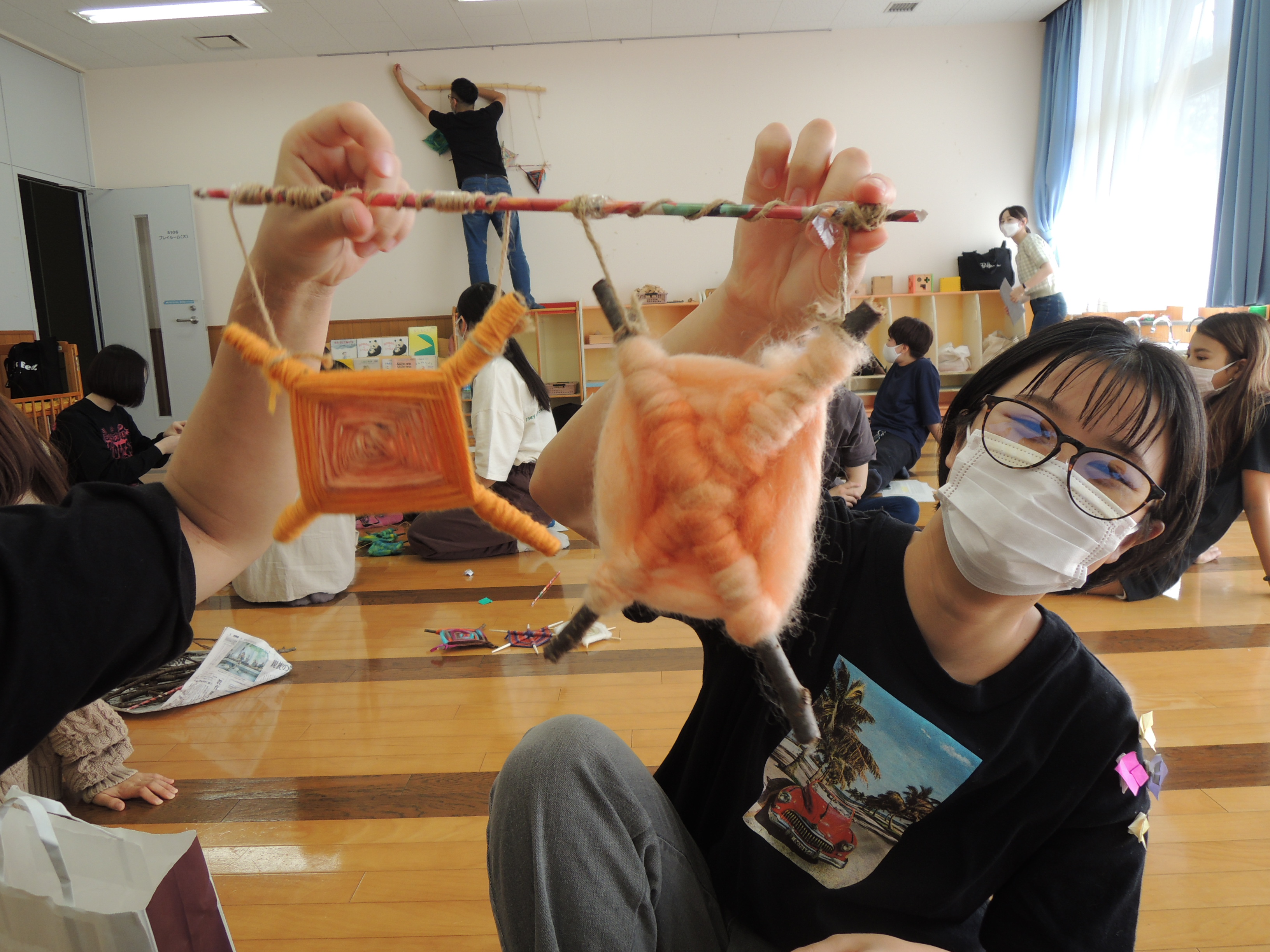 1週間前。久しぶりの対面ポッケを前にポッケルームを温かな雰囲気にしようと、学生が枝と毛糸を使って様々な色合いの飾りを作ってくれました。先ずは、枝2~3本を固定。