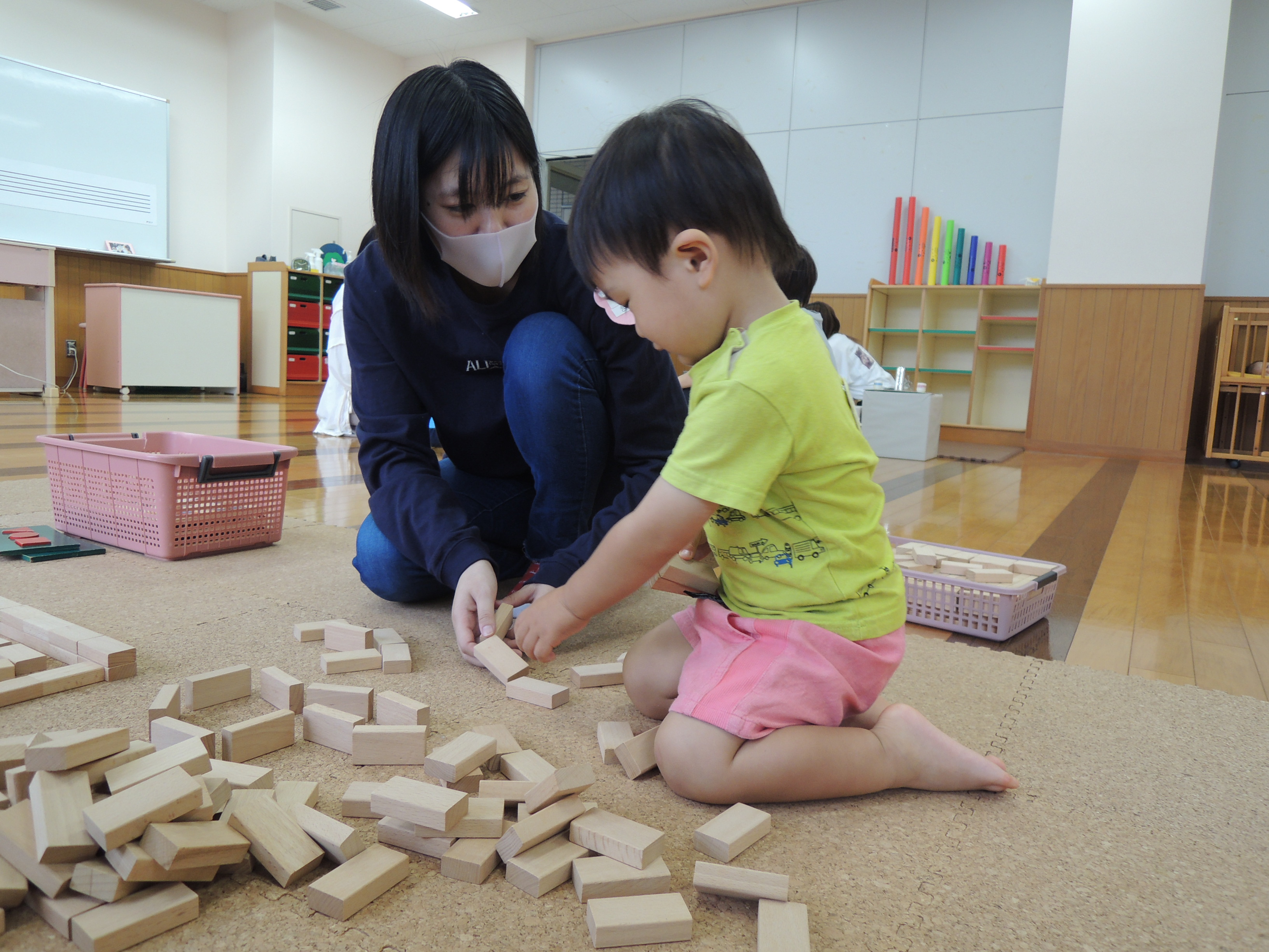 平松先生によるリトミック♪ 学生と一緒に、積み木で『きのこ』を表現。2~3歳の子どもたちは、「きのこ」と聞いてどんなものを想像するんだろう・・・。大人が思い浮かべる『きのこ』とは別物かもしれないけれど、子どもたちが、それぞれに考えながらあれこれ集中して積み木を積んだり並べたりしていました。これ、積み木だから、かな~。すごい!