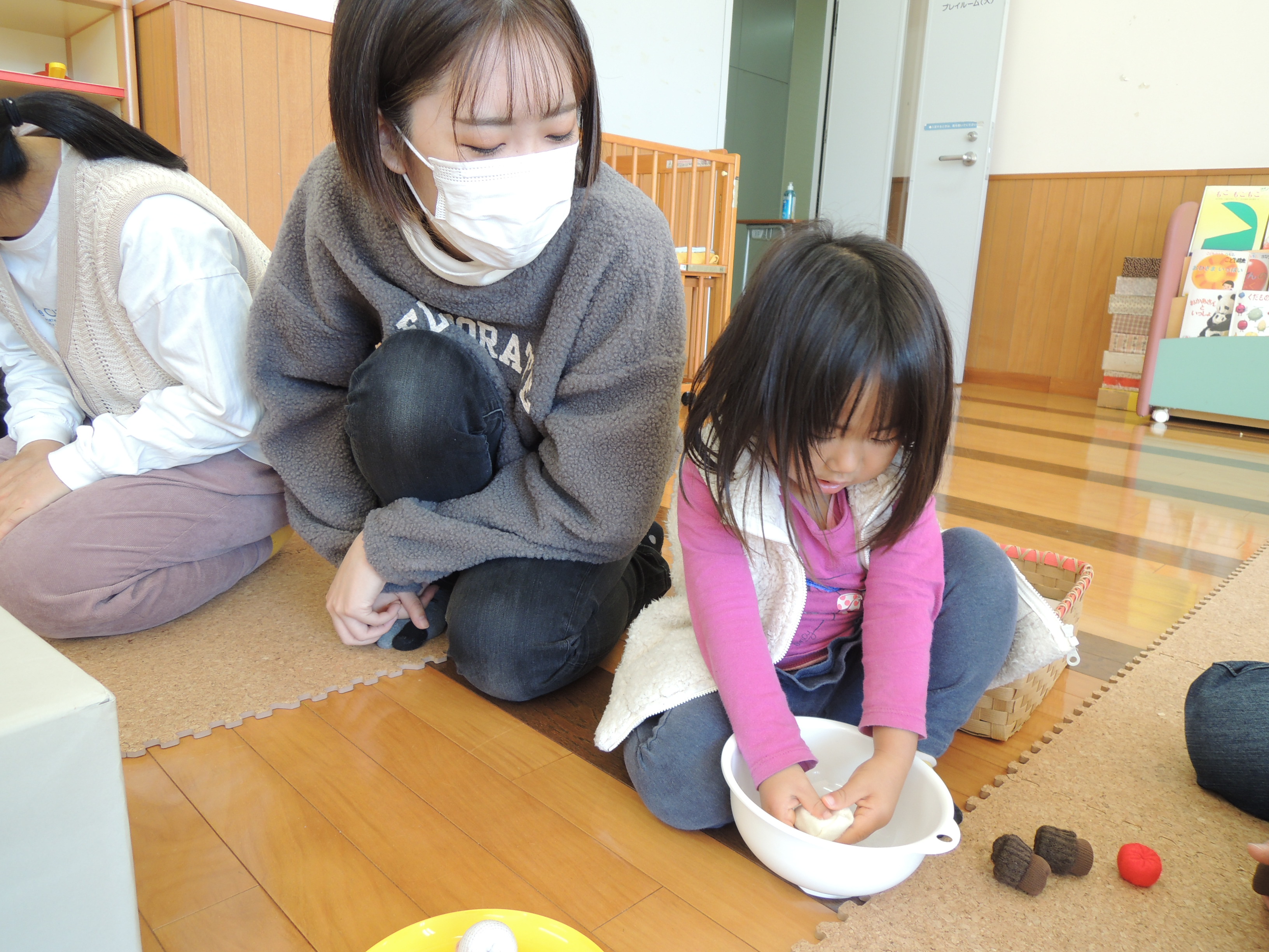 お母さまはピザを焼くことがよくあるそうで・・・子どもって本当にお母さんのことを見ていますね~♪ ままごとあそびで生地をこねる姿に感心しちゃいました。