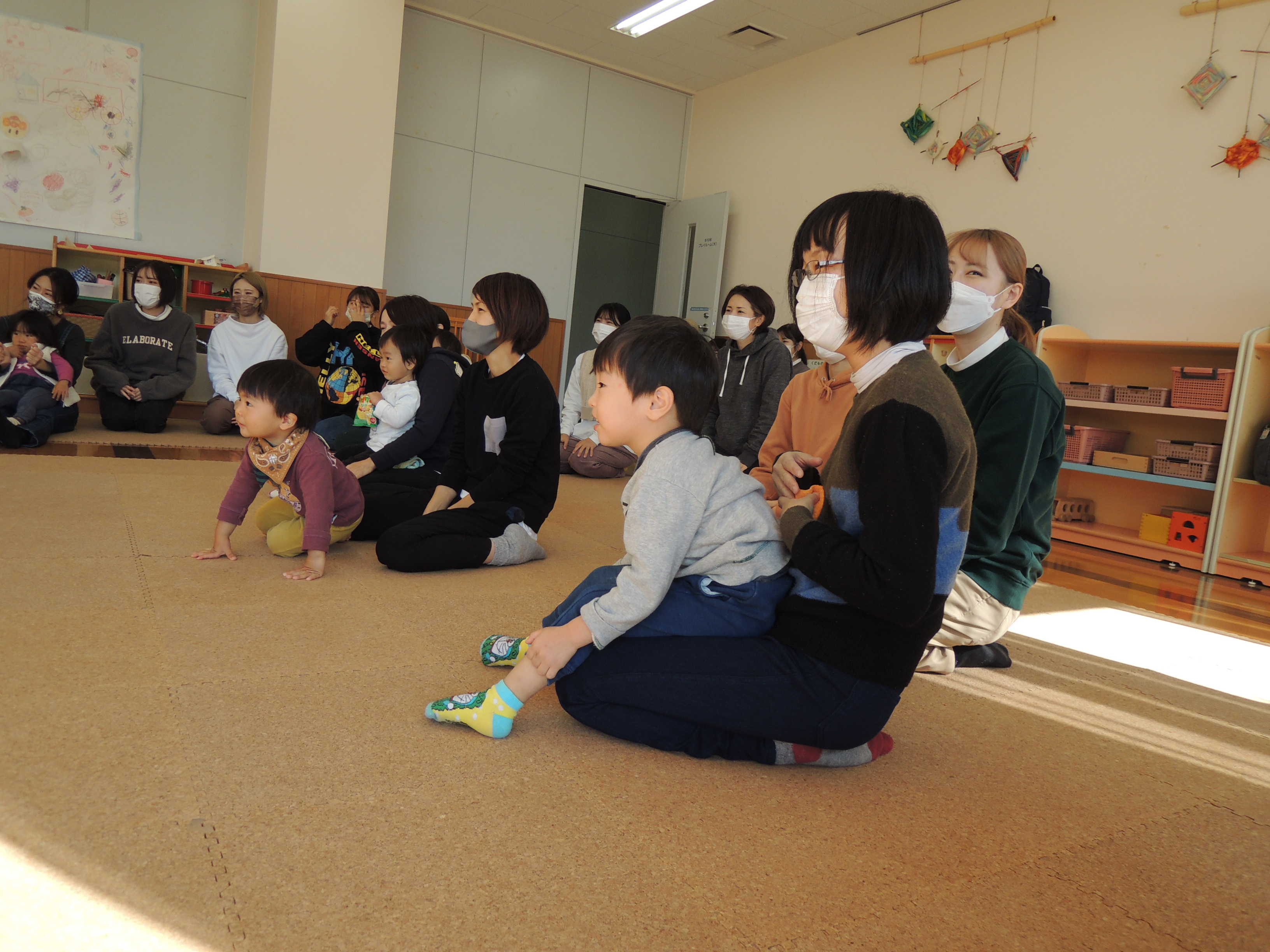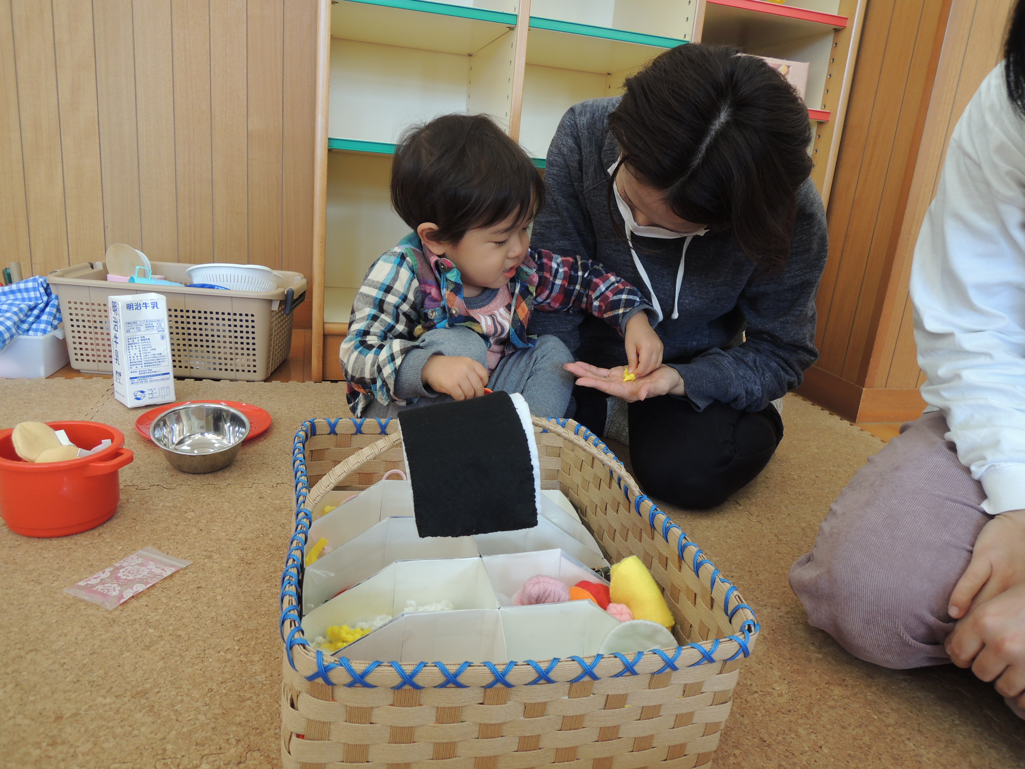 今日の「成長祝い」。お母さまの我が子への愛おしさと成長の喜びを皆と共感し合います。お祝いカードを渡すと、そこに貼った自分の写真をしばし見入っていました。
