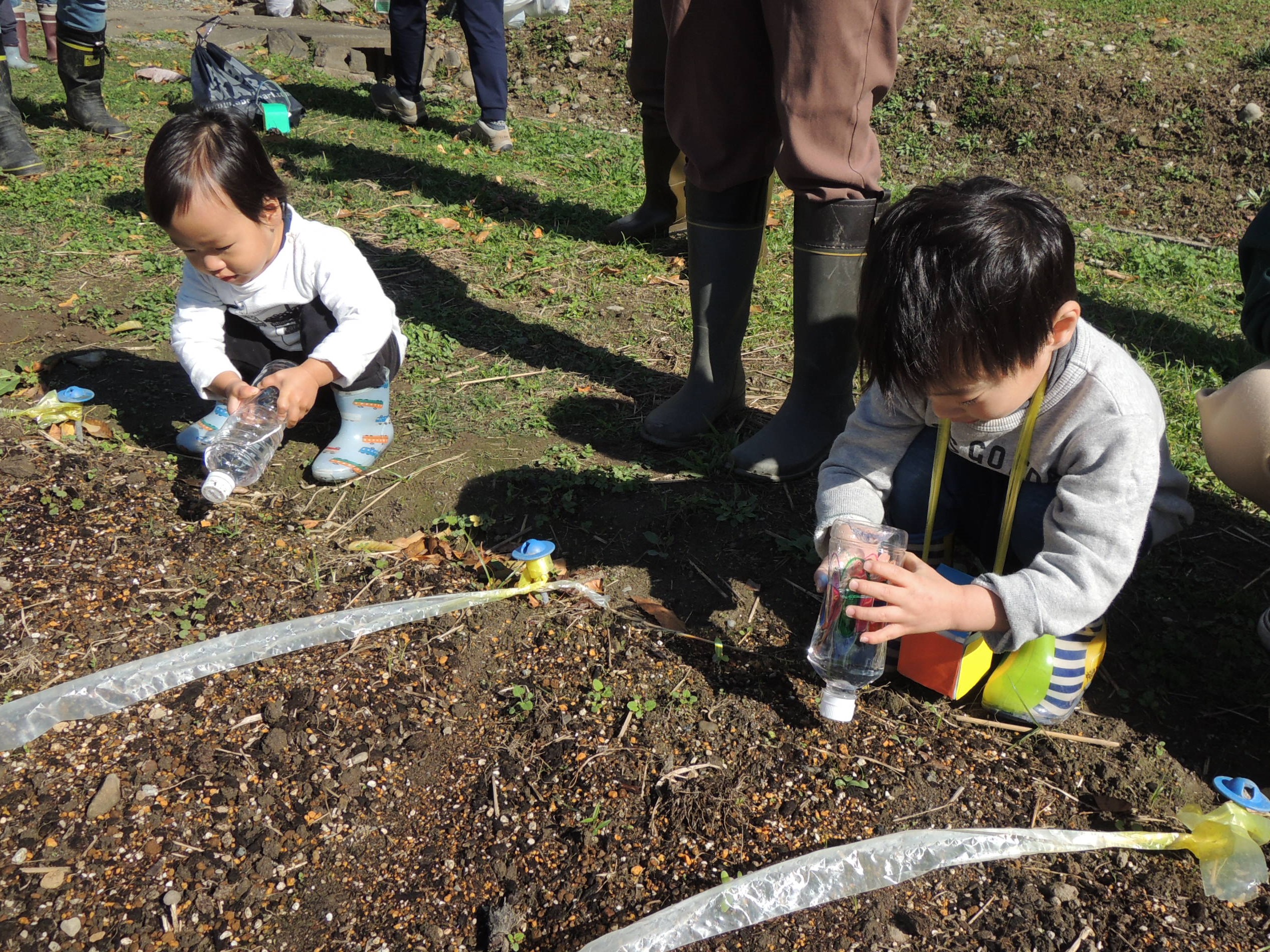 前回播いた花の種から少しずつ芽がでていました。そこにも、水をあげてくれました。