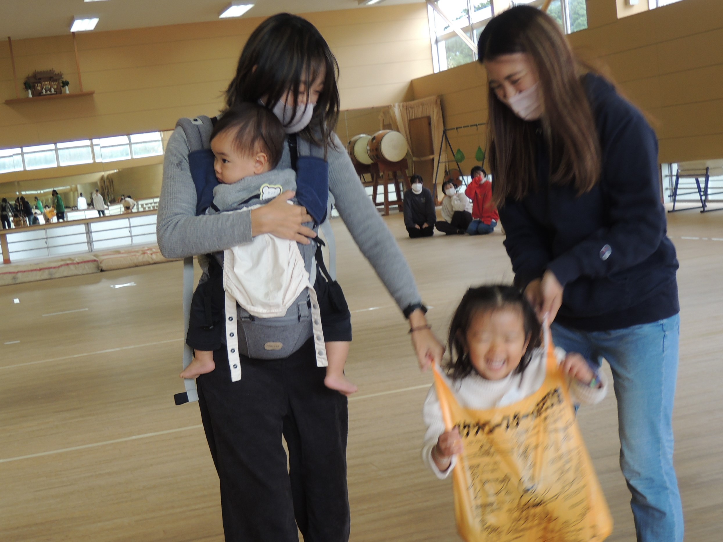 へぇ~!脚を案外広げられることに、ビックリ!お母さまたちも、やらせてみてなかったけど、ここまで一人で開脚できる、を発見したかもしれません。