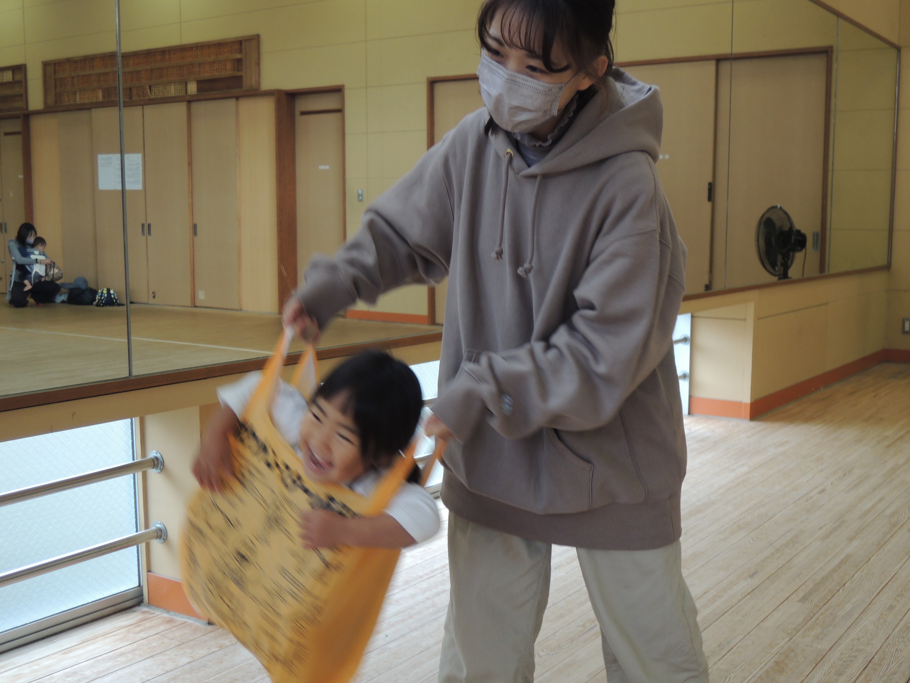 家ではお父さまがこうやってよく遊んでいるかもしれませんね~♪ お子さんを揺らしたり逆さに抱いたり・・・♬大人の目線より高くなったり逆さになったりする感覚を育むのにもいいそうです♬