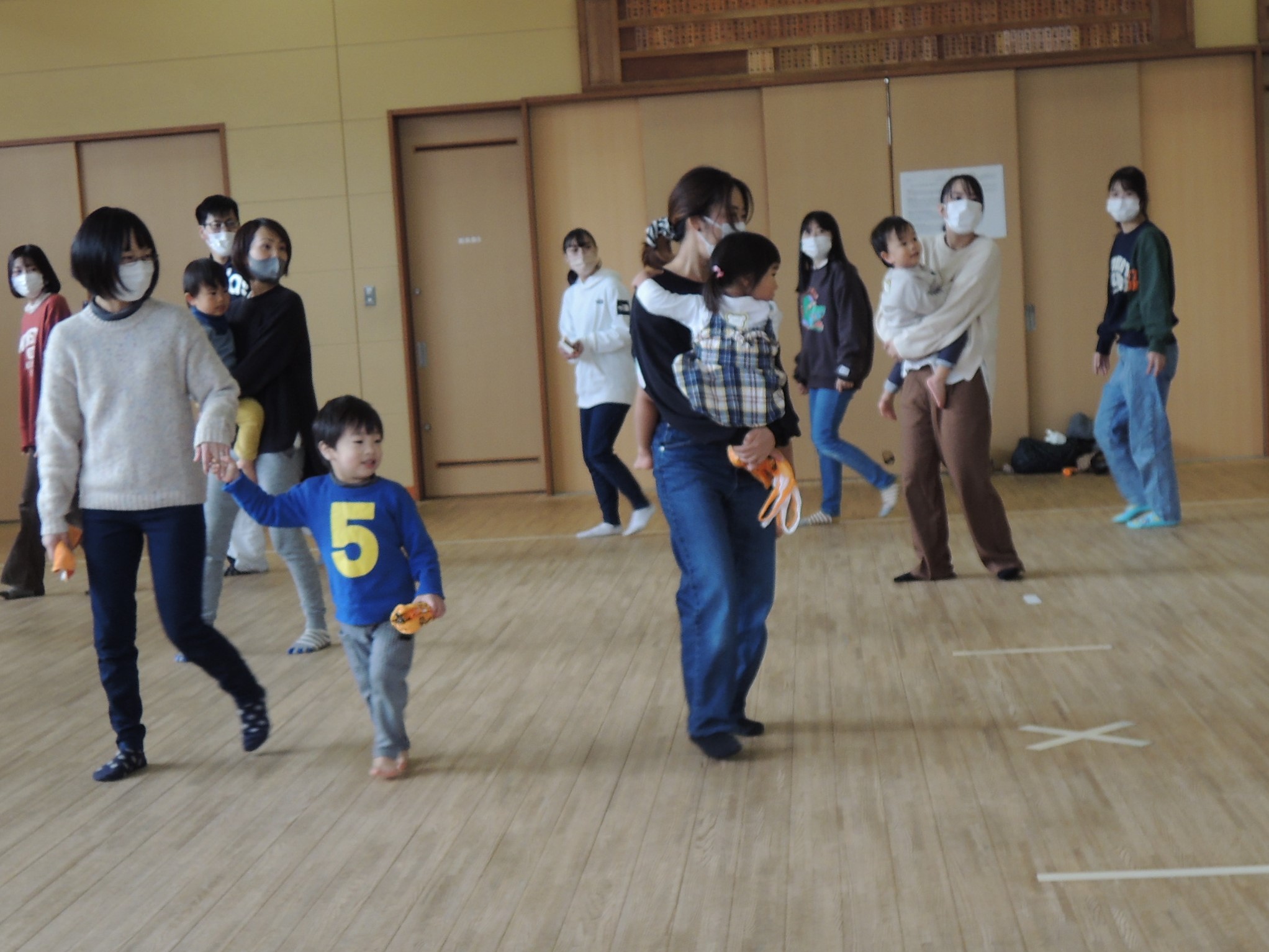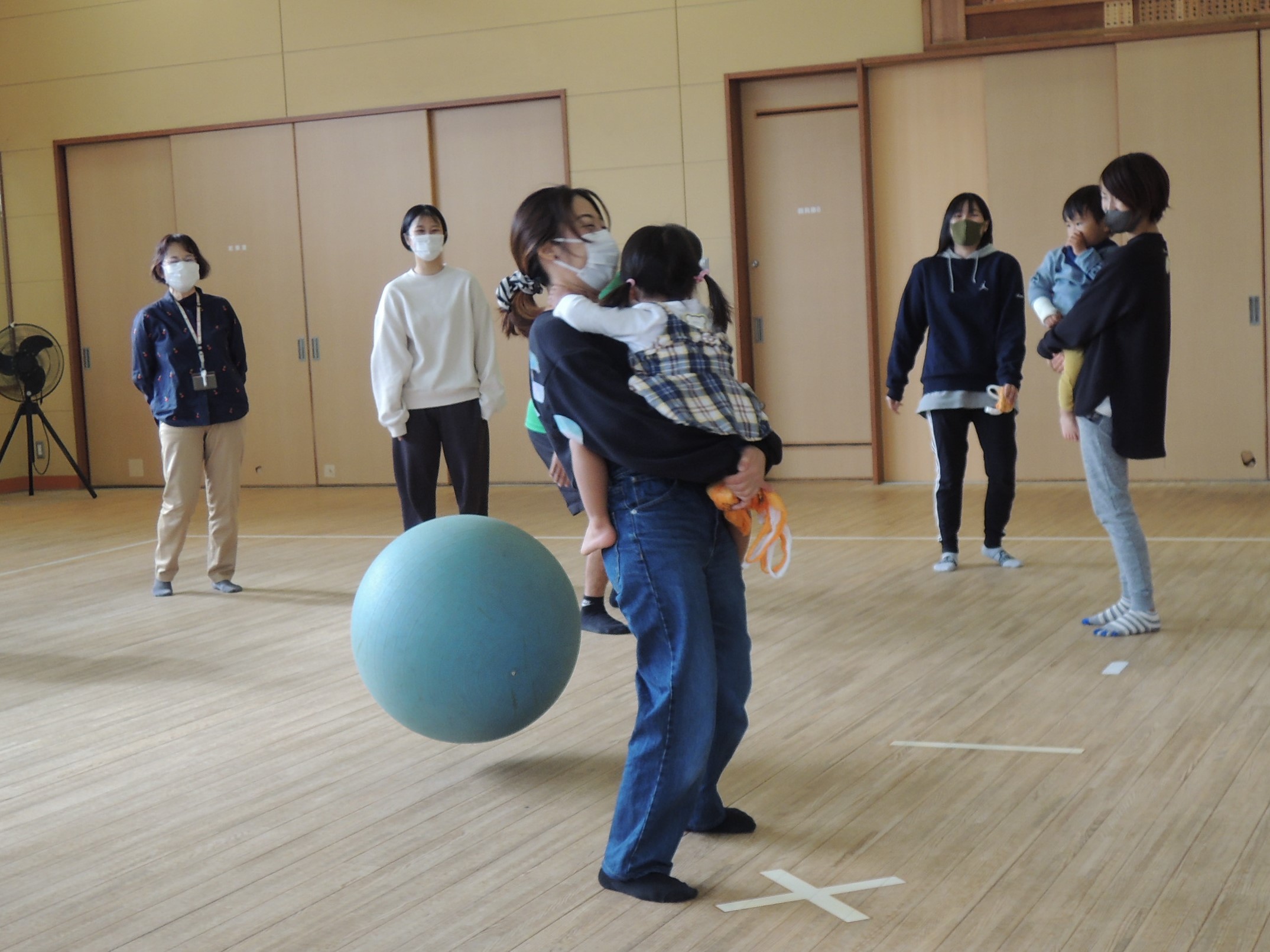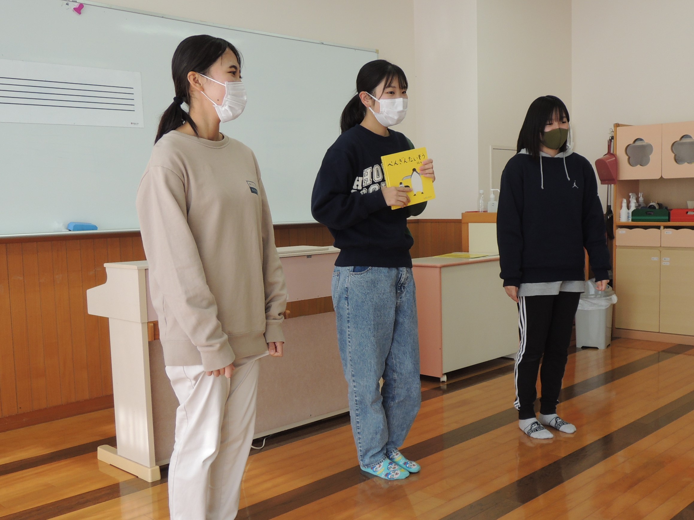 お姉さんたちが『ぺんぎんたいそう』の絵本を読んだ後、みんなで実際に『ぺんぎんたいそう~』♪