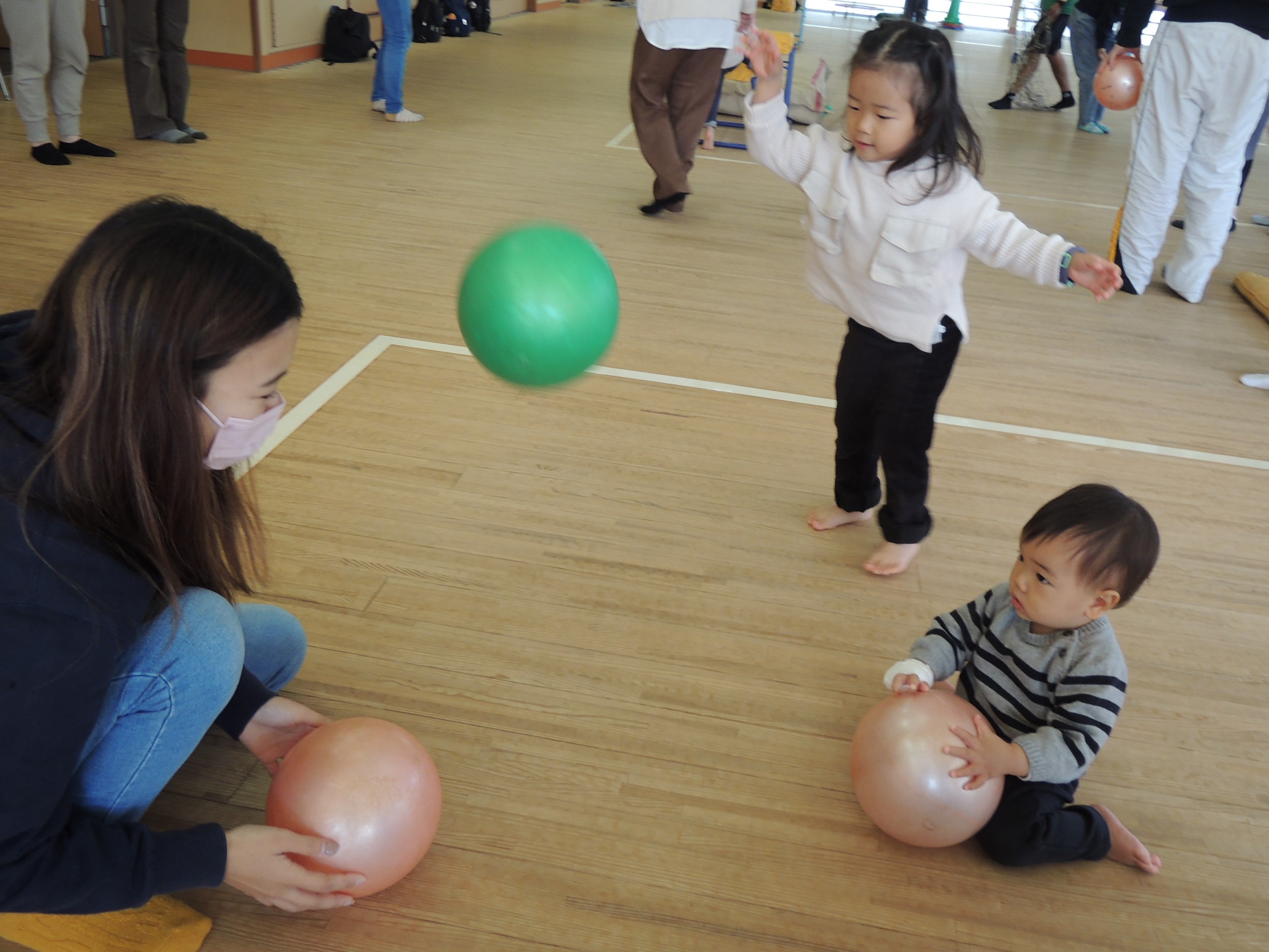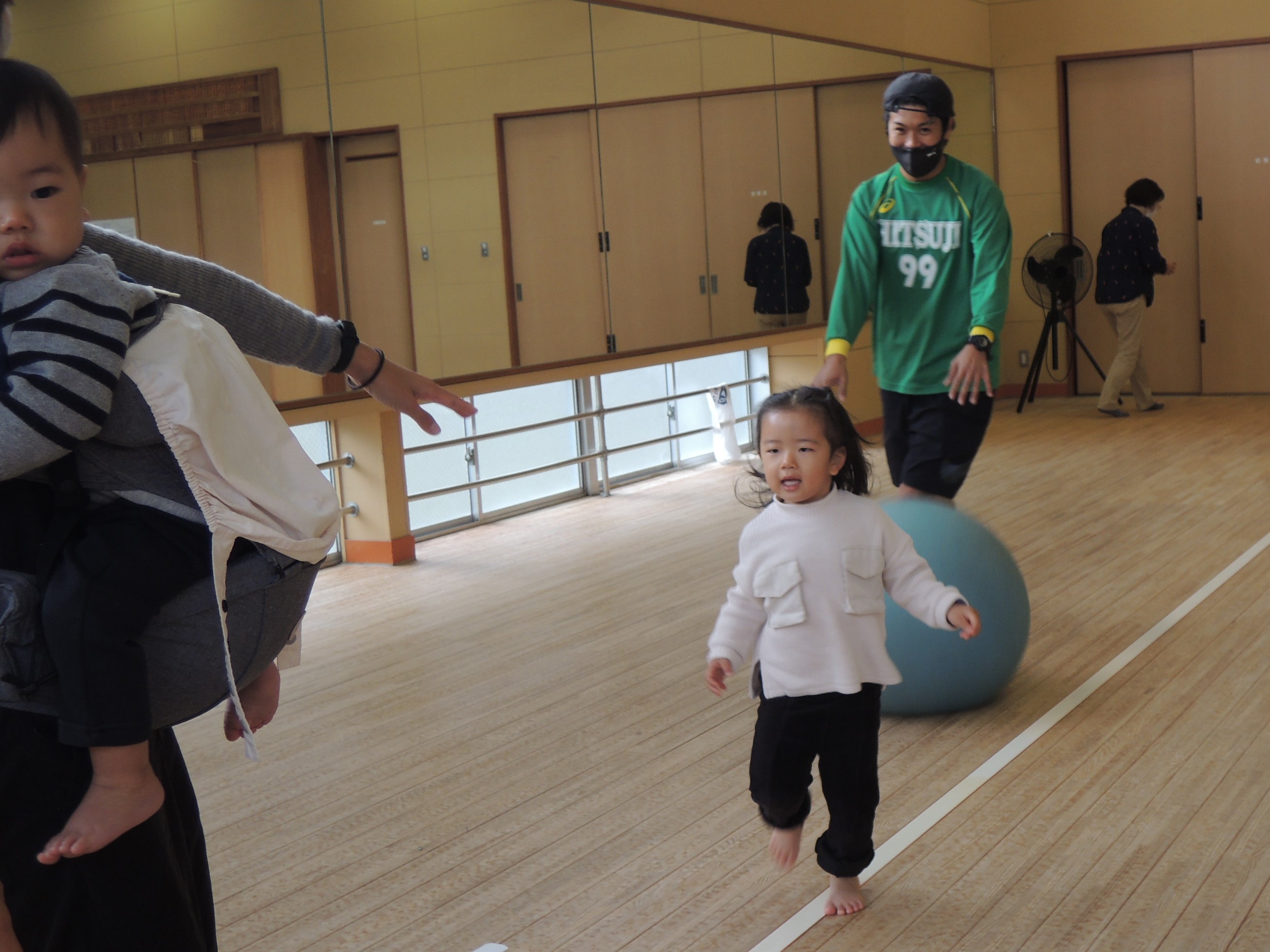 今日の会場、広い「剣道場」に着くと、すぐにボールに興味を示し遊びだします。