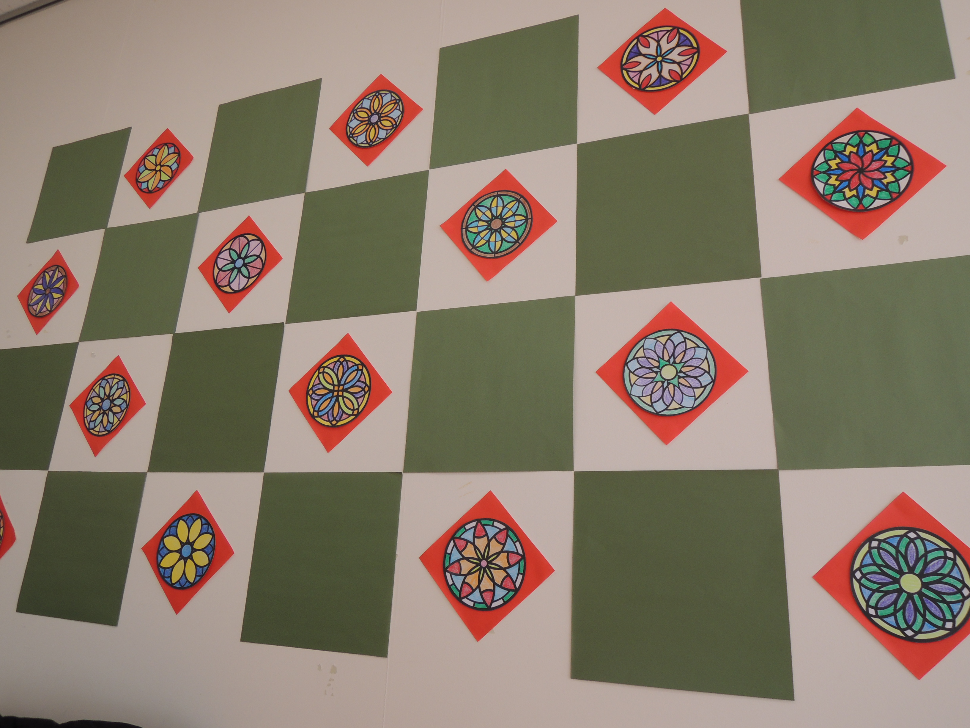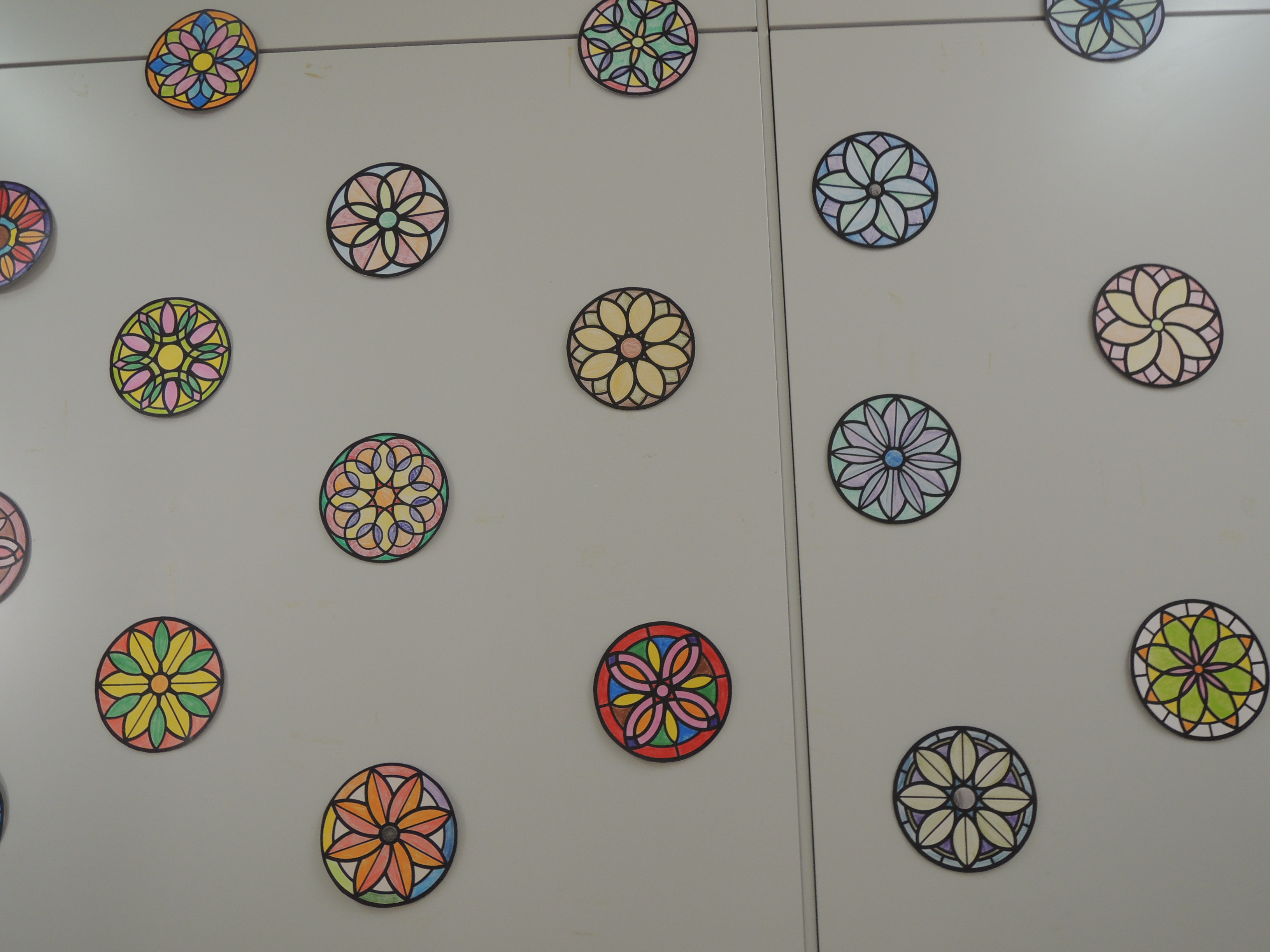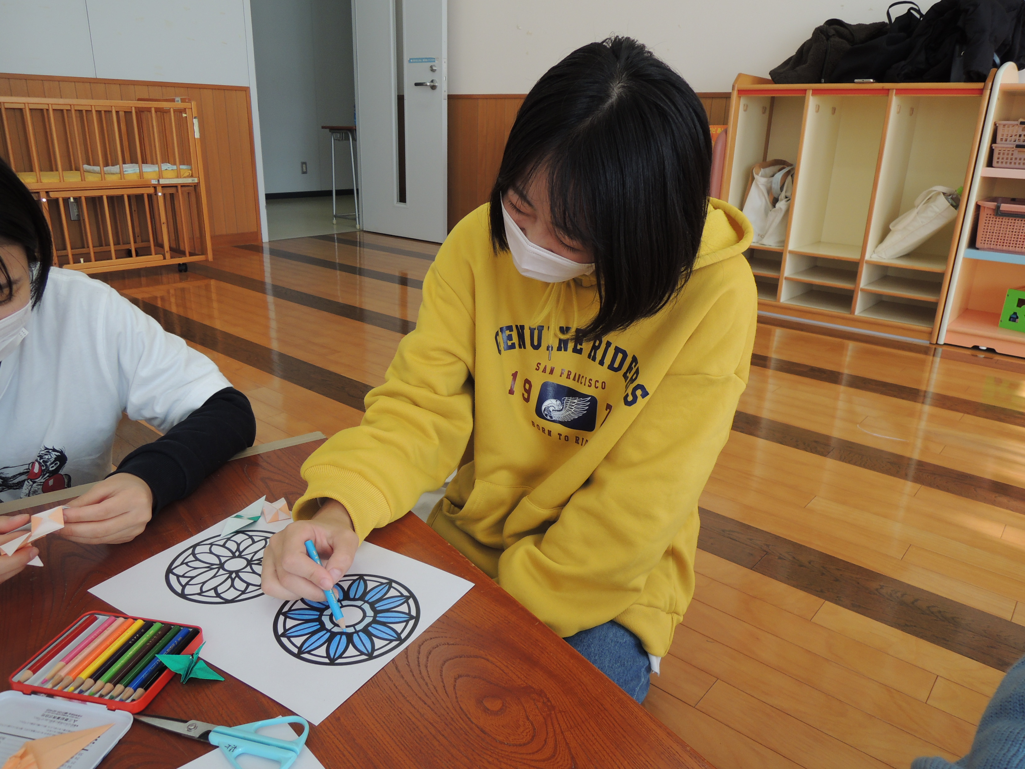 前回の「親子で楽しむ幼児運動」で楽しんだことを家でお父さまと楽しんだそうです💛。揺らされてる感覚、どんなだろう~♪ ひたすら、塗り絵~♪ ポッケルーム前の廊下に、学生たちが飾りました。 市松模様も、奇麗~
