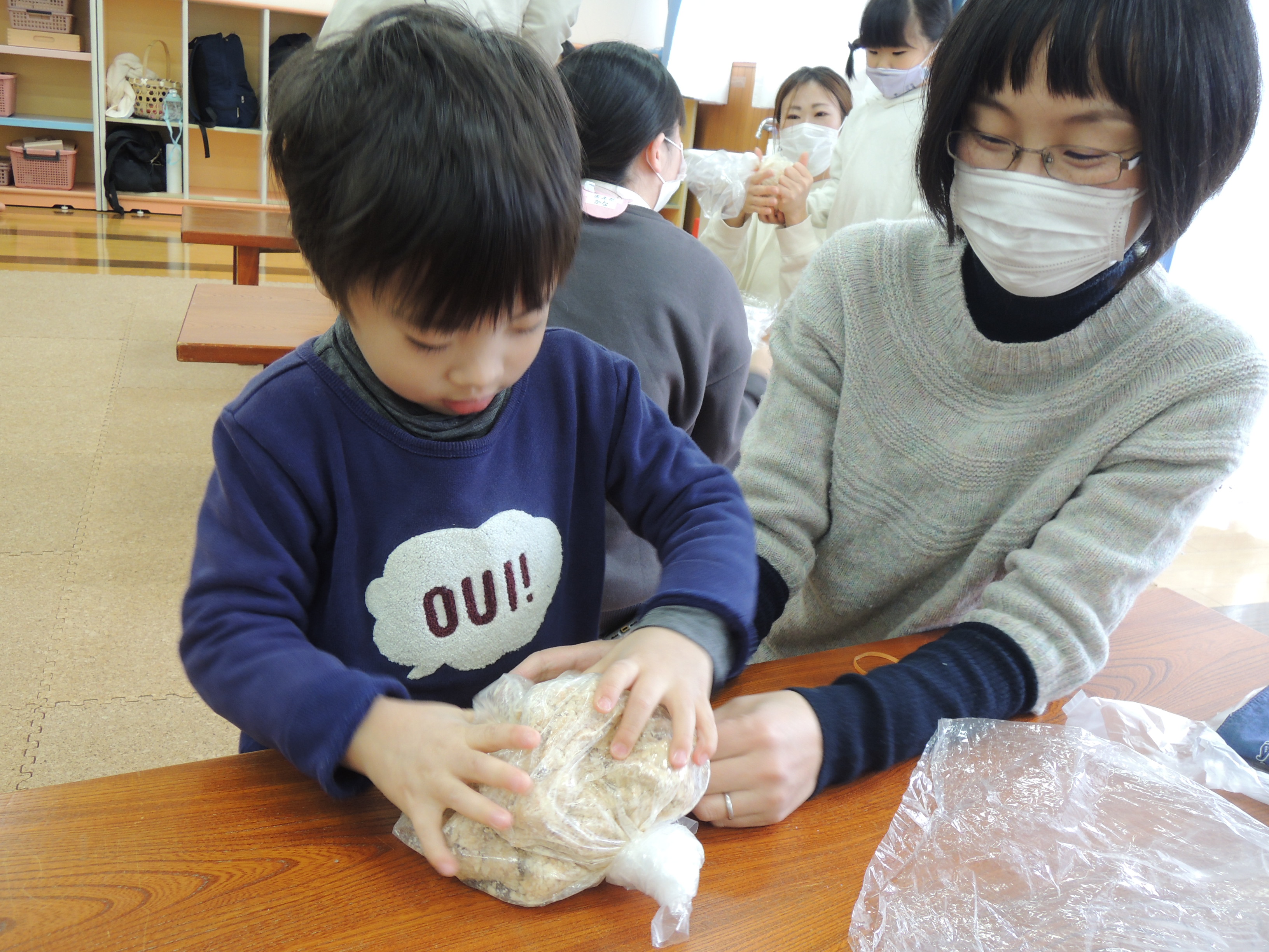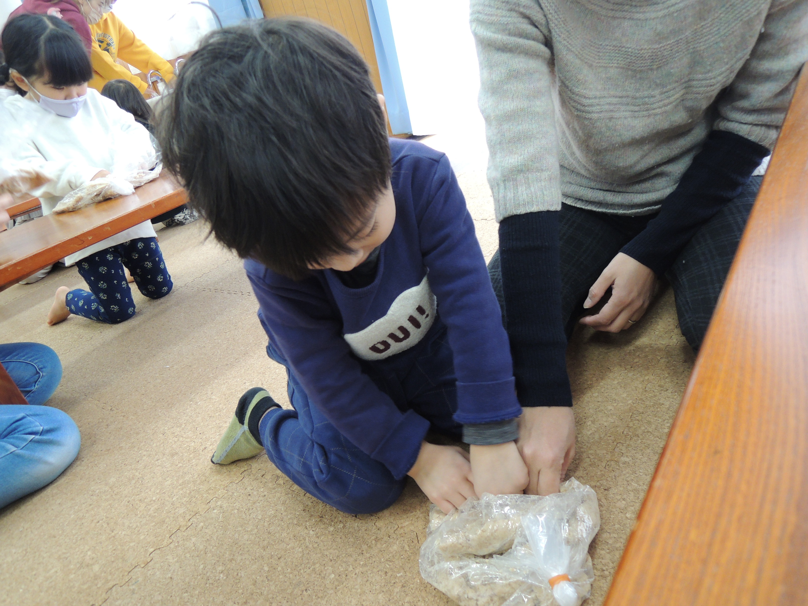 塩こうじを、つぶした大豆によく混ぜ込み、空気を抜いたら出来上がり!樽などに漬け込むときは、味噌玉を投げつけることを阿部先生から教わりました。半年(以上)後まで、じっくり熟成し美味しい味噌になるのを待ちます♬