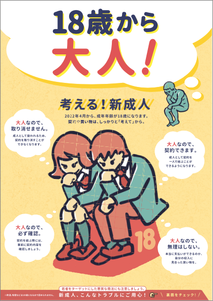 皆さん、既にご承知のとおり、民法の改正によって令和4年4月1日から成年年齢が20歳から18歳に引き下げられます。成人になることで父母等の同意なしに契約やクレジットカードを作れるようになります。関係省庁のホームページでは、成年年齢引下げに関する特設ウェブサイトが開設され、成年年齢の意義、消費者契約等において気を付けることをマンガやクイズで紹介しています。春休み中に、ぜひ参考にして、消費者トラブル等から自分の身を守る術を学びましょう。