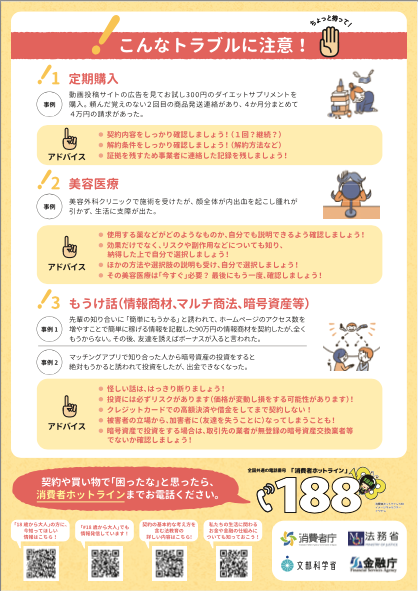 | 消費者庁ホームページ | 「社会への扉」 https://www.caa.go.jp/policies/policy/consumer_education/consumer_education/lower_the_age_of_adulthood/movie/ (別ウィンドウで開きます) |