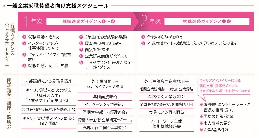 将来の目標に向かってどのように大学生活を送るか、自分にはどんな適性があるのか、具体的な進路に合わせたキャリア対策まで、各段階で必要なセミナーや講座を用意。綿密なサポートプログラムで、一人ひとりの能力を最大限に活かせる進路をめざします。