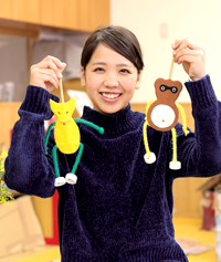 赴任した初年度の担当が0,1 才児クラスでした。在学中も関わることが少なかった年齢なので、子どもの成長を促す関わり方、遊び方が難しく苦労しました。そんなときに役に立ったのは、大学での実習やゼミ活動での実践です。今では私のことを「先生」と言って慕ってくれる子どもたちに毎日元気をもらい、癒やされています。