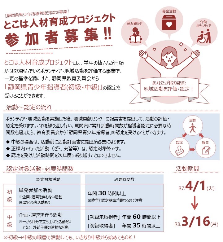 とこは人材育成プロジェクトとは、静岡県教育委員会が主催する「静岡県青少年指導者級別認定事業(初級・中級)」の認定を受け常葉大学(以下、本学という)が実施する事業であり、本学学生をはじめとした参加者の日頃の地域貢献活動やボランティア活動を評価し、静岡県青少年指導者に認定されるものです。