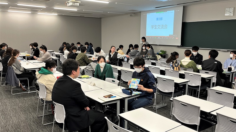 日頃の地域貢献活動で学んだこと、工夫したこと、苦労したことなど、「地域貢献活動から得られること」をテーマに学生交流を行い、「大学内だけでは得ることができない学びがあった」「前期は動きがないが、後期にあわただしく動き出すため、連携先と密にコミュニケーションを取ることやスケジュール管理が大事」など、学生が活動を通して感じたことを意見交換しました。