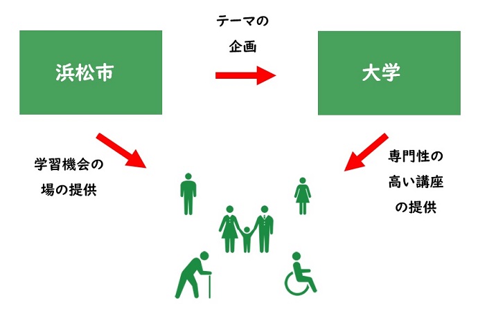 浜松市では、生涯学習を推進するためにめざす都市像として「楽しみや生きがいが見つかるまち・浜松」、行動指針として「夢や好奇心をもって行動を起こし、仲間とのつながりを広げよう」を掲げております。浜松市民アカデミーは、この指針の実現のため、人生を豊かにする学習意欲の高揚を図り、専門性の高い学習機会の場となるよう、静岡県西部地域の大学と連携して毎年開催しており、令和7年度で33回目を迎えます。浜松市民アカデミーへの参加を通して、学び直しとしてのリスキリングの重要性を体感し、身近にある大学の専門的見地による最新知識に触れて、あなた自身をブラッシュアップしてみませんか?