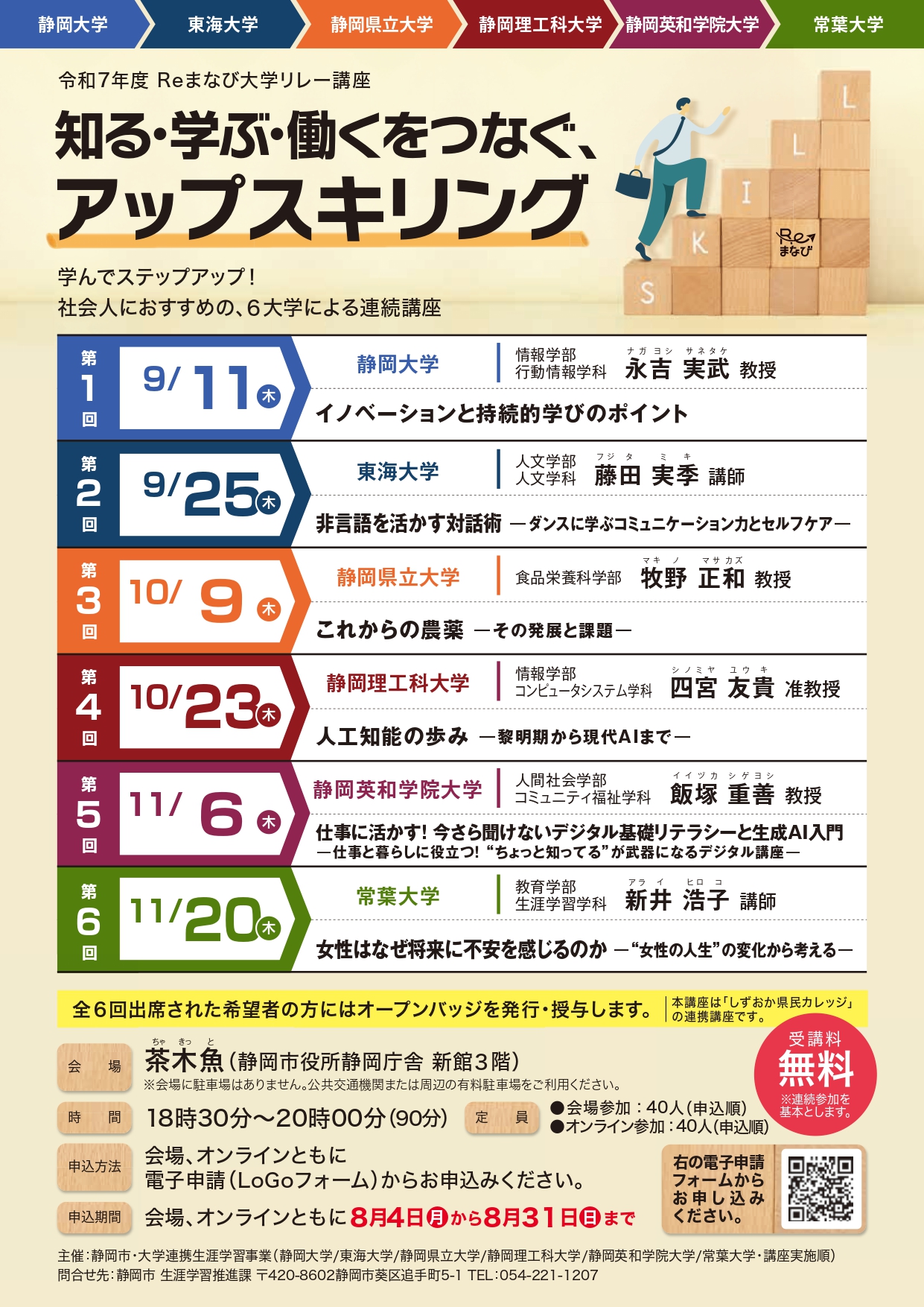 令和年度は「知る・学ぶ・働くをつなぐ、アップスキリング」をテーマに、静岡市内6大学が様々な切り口から講義します。