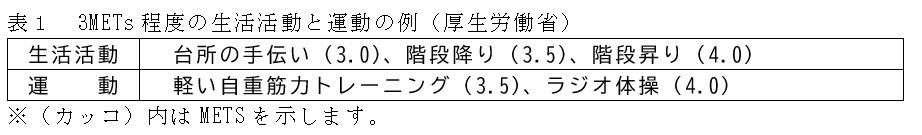 厚生労働省(身体活動基準2013)は、身体活動の低下を防ぐためには、①強度を問わず身体活動を40分行いこと、②3METs以上の身体活動を行うこと、を推奨しています。ここでいうMETsとは、「からだを安静にしている時の何倍の強度か」を示す単位です。勿論、運動を取り入れることも効果的ですが、表1にように、普段の日常生活でも3METsに相当する活動があります。これら日常にある“やや高い強度”の身体活動を取り入れた日常を過ごすことも、生活不活発病の予防に効果的です。