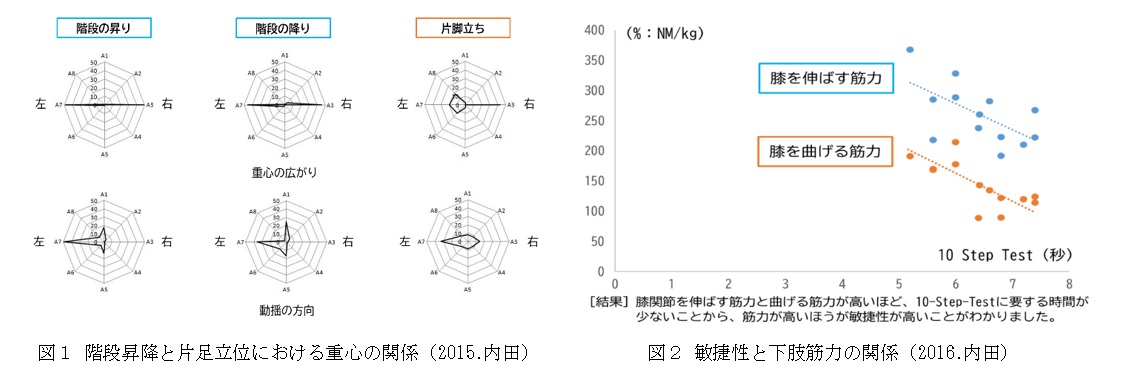 図1は、「階段昇降」と「片足立ち」を行っている時の重心の揺れ方(幅と方向)を比べたものですが、いずれも左右方向へ重心が揺れるという特徴が似ていることから、階段の昇り降りを行うことでバランスが良くなることが期待できます。