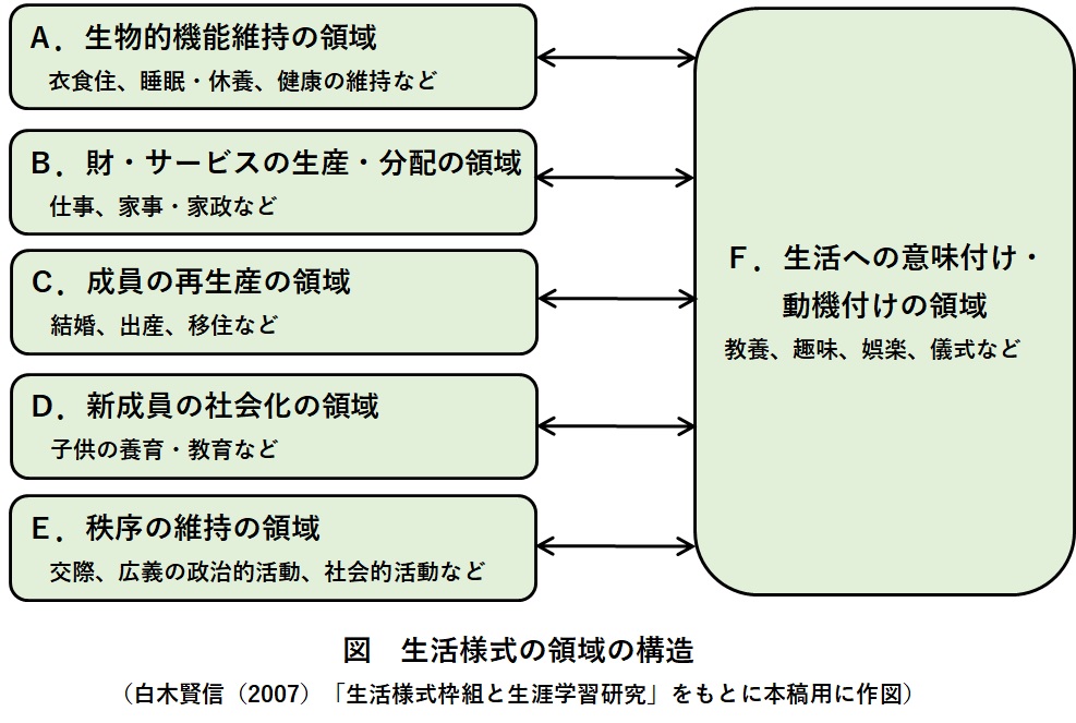 論文では、白木賢信(2007)「生活様式枠組と生涯学習研究」(日本生涯教育学会編『生涯学習研究e事典』所収)http://ejiten.javea.or.jp/contente385.html(2020年5月21日閲覧)でまとめたことがあります。