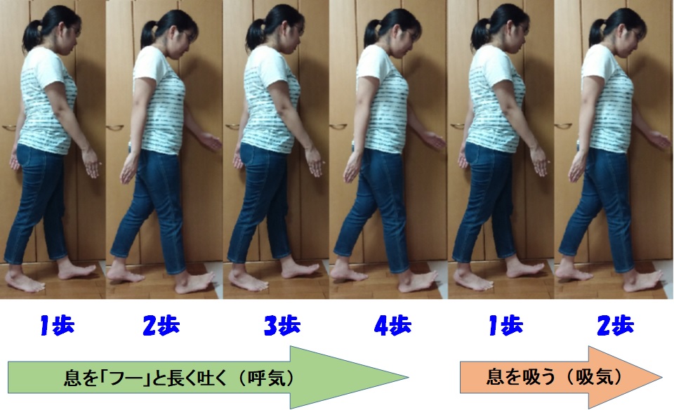 苦しくなる前から、空気を「口からはいて、鼻から吸う」と意識します。歩行では、呼吸することに歩くリズムを合わせましょう。目安は、「フー」と長く息を吐く間に4歩、「スー」と息を吸う間に2歩進みます(図1)。