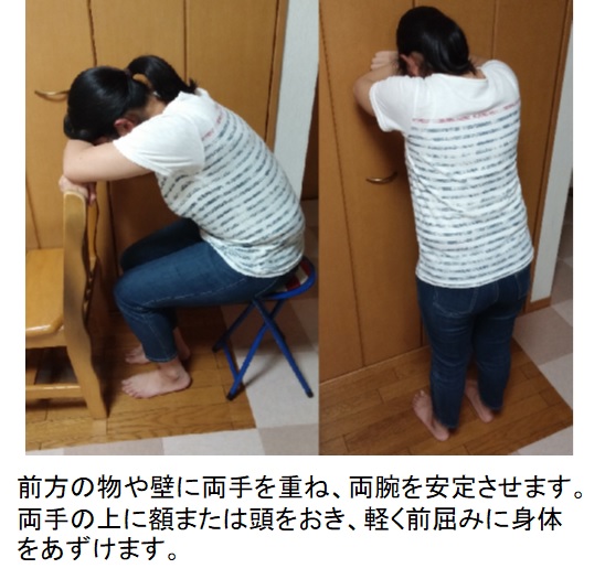 こうして、肩甲骨まわりや首まわりの筋肉を腕の動きや頭の支持から解放し、呼吸に集中しやすくしてあげます。腕の高さや前かがみの角度は苦しくない程度に調整してください。息苦しさが落ち着いてから、動作を再開しましょう。