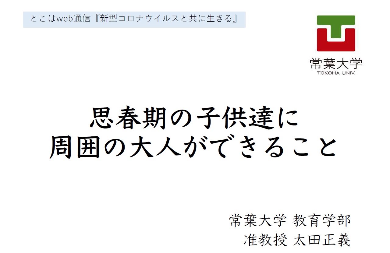 思春期の子供達に周囲の大人ができること 新型コロナウイルスの流行によって、子供だけではなく、大人の生活環境も大きく変わりました。気づかないうちに大人も大きなストレスにさらされている可能性もあります。 子供の姿を見て、怒ってしまうこともあるでしょう。もしかしたら、イライラが募るのはストレス反応かもしれません。 話を聞いてもらうのは、子供だけではなく大人にも有効です。怒りが収まらない時は、積極的に誰かに話を聞いてもらいましょう。 本講座の内容は、下記のPDFファイルを開くことでご覧いただけます。 思春期の子供達に周囲の大人ができること (PDF ファイル 0.86MB) 執筆者 太田正義 教育学部心理教育学科 准教授 (専門は教育心理学)