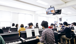 小学校の音楽の授業を指導するうえで、教員にはピアノの技能が欠かせません。また音楽教育を充実させるためには、単に伴奏ができるだけではなく、音楽的に表現する力が求められます。「音楽IA」では各自が1台の電子ピアノを使って課題曲を練習し、実技の指導を受けます。これにより、小学校教員に必要なピアノの技能を基礎から身につけます。
