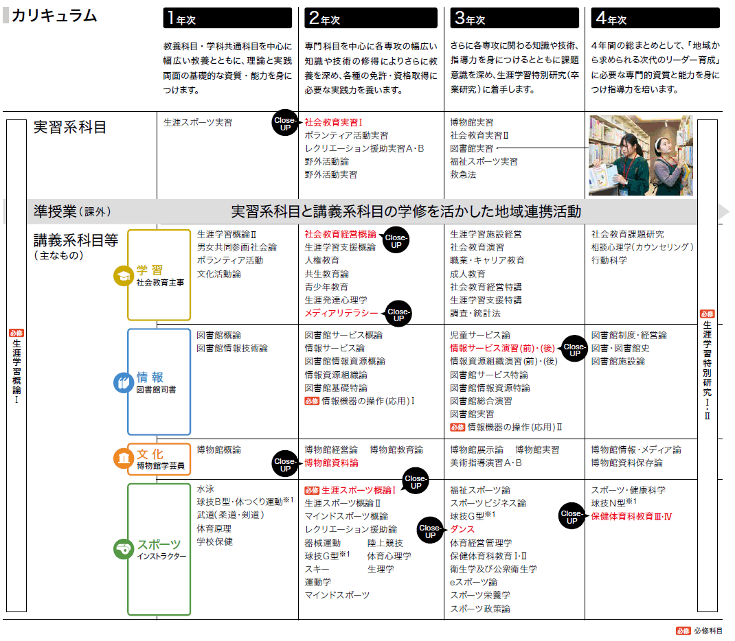 生涯学習に必要な施設やメディアなどを活用し、さまざまな「学び」を企画・提案していくことのできる人材を育成します。地域に根差した活動によって、地域の生涯学習の推進・発展を目指します。