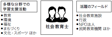 これからの地域の教育・学習を支えるキーパーソン2020年度以降の入学者は、社会教育に関する指定科目を修得することにより、「社会教育士」を名乗ることができるようになります。社会教育士には、社会教育施設はもちろん、教育・学習に関わる行政、NPO法人、民間教育機関などで活躍することが期待されています。主な役割は、教育はもちろん、環境、福祉、まちづくり、さらには文化・スポーツなど、多様な分野における学習活動の支援です。最近は、学校も地域社会と協力しながら教育活動にあたっていく時代のため、地域教育コーディネーターなど、学校教育と関わっての活躍も期待されます。