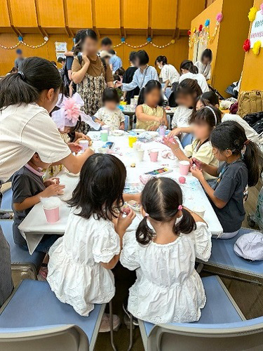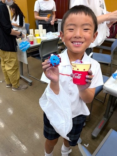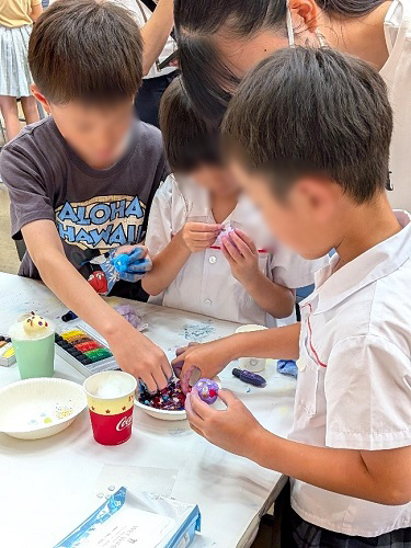 紙粘土をこねる感触を楽しみながら、どんな色にするのか、どんな飾りつけをするのか考えながら集中して制作する子どもたちの姿が見られました。そうした子どもたちに学生たちは寄り添い、コミュニケーションも自然に生まれ、作業の状況によっての声掛けも工夫しながら、何よりも子どもも学生も一緒に楽しい時間を過ごすことができました。