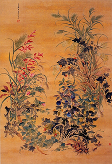 絹本の大画面に五穀(米、麦、粟、豆、黍)などと野菜を適宜描いている。下方には牛蒡(ゴボウ)、慈姑(クワイ)、茄子(ナス)などの野菜が見える。背景には金泥を掃き、淡彩ではあるが丁寧に描いている。