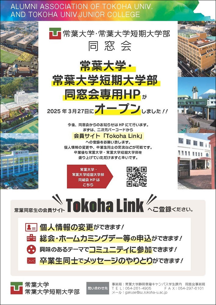 | 常葉大学・常葉大学短期大学部同窓会専用HPを開設しました。 ぜひアクセスいただけますと幸いです。 同窓生の皆さま、ぜひHPにアクセスいただけますと幸いです。 アクセス頂きましたら、同窓生専用会員サイト『Tokoha Link』へご登録ください。 |
