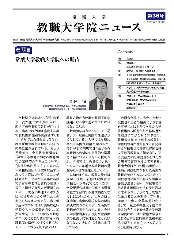 教職大学院ニュース 教職大学院ニュースをご覧いただけます。(別ウィンドウで開きます) 最新号は画像をクリックしてご覧ください。 バックナンバー 常葉大学 教職大学院ニュース 第35号常葉大学 教職大学院ニュース 第34号常葉大学 教職大学院ニュース 第33号常葉大学 教職大学院ニュース 第32号常葉大学 教職大学院ニュース 第31号 最新号 第36号 常葉大学 教職大学院ニュース 第30号常葉大学 教職大学院ニュース 第29号常葉大学 教職大学院ニュース 第28号常葉大学 教職大学院ニュース 第27号常葉大学 教職大学院ニュース 第26号常葉大学 教職大学院ニュース 第25号常葉大学 教職大学院ニュース 第24号常葉大学 教職大学院ニュース 第23号常葉大学 教職大学院ニュース 第22号常葉大学 教職大学院ニュース 第21号 常葉大学 教職大学院ニュース 第20号常葉大学 教職大学院ニュース 第19号常葉大学 教職大学院ニュース 第18号常葉大学 教職大学院ニュース 第17号常葉大学 教職大学院ニュース 第16号常葉大学 教職大学院ニュース 第15号常葉大学 教職大学院ニュース 第14号常葉大学 教職大学院ニュース 第13号常葉大学 教職大学院ニュース 第12号常葉大学 教職大学院ニュース 第11号 常葉大学 教職大学院ニュース 第10号常葉大学 教職大学院ニュース 第9号常葉大学 教職大学院ニュース 第8号常葉大学 教職大学院ニュース 第7号常葉大学 教職大学院ニュース 第6号常葉大学 教職大学院ニュース 第5号常葉大学 教職大学院ニュース 第4号常葉大学 教職大学院ニュース 第3号常葉大学 教職大学院ニュース 第2号常葉大学 教職大学院ニュース 第1号 常葉大学 教職大学院10周年記念誌 常葉大学 教職大学院10周年記念誌をご覧いただけます。 画像をクリックしてご覧ください。(別ウィンドウで開きます) ページの先頭へ戻る
