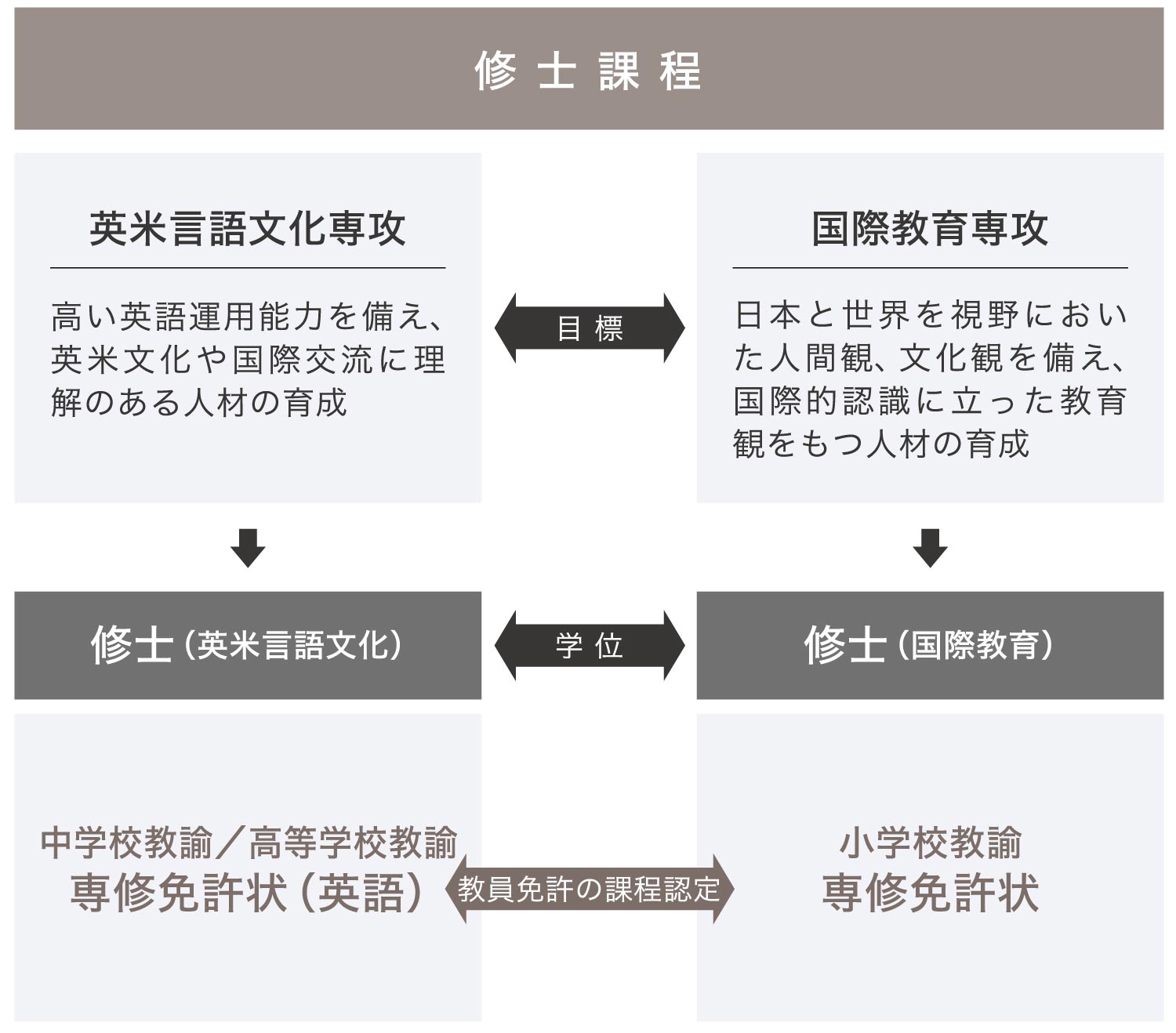 | 国際教育専攻 | 〈学位授与〉 国際教育専攻では、修了に必要と定められた単位を修得し、かつ修士論文審査に合格した者には、学位「修士(国際教育)」を授与する。
