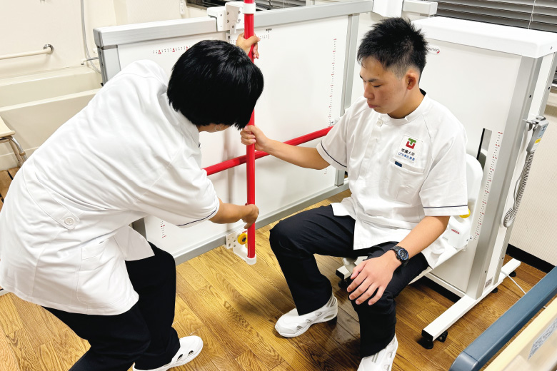 日常生活における食事、トイレ、入浴などの援助や支援方法について学びます。さらに、シミュレーターを用いて退院後の自宅環境についても検討を行います。