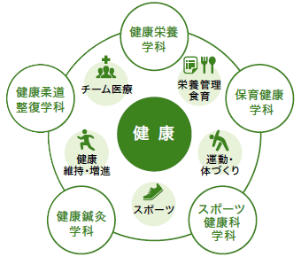 健康とは身体・精神の両面において、人生を満足して生きていくための基本テーマです。本学部では健康に対する時代のニーズに応え、さまざまな切り口から人材を育成しています。同時に、各学科が具体的なキャリアと直結しているのも特長の一つです。幅広い分野を学びながら自分の進路に合わせて、「教育」「スポーツ」「医療」の資格取得を目指し、各分野の専門知識と技術を身につけます。