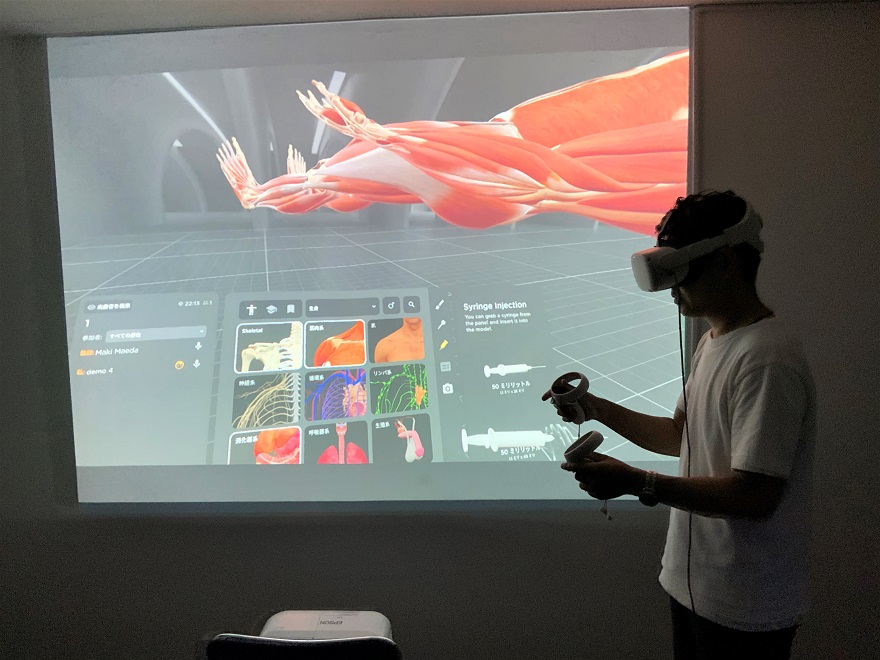 これまでの教科書、動画を使用した授業方法に加え、仮想空間で3次元的に学ぶバーチャル授業を導入することで、人体の臓器の位置、他臓器との位置関係などについて、正確かつ速く学修できるよう取り組んでいます。