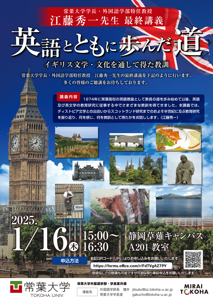 本講義では、「英語とともに歩んだ道 -イギリス文学・文化を通して得た教訓-」と題して、江藤学長が、ディストピア文学との出会いからスコットランド研究までのおよそ半世紀に及ぶ教育研究を振り返り、何を感じ、何を教訓として得たかをお話する予定です。