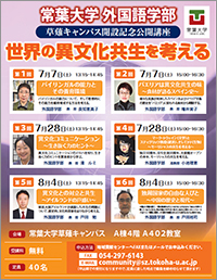 皆様にご好評をいただき終了した本学外国語学部の公開講座「世界の異文化共生を考える」のうち、7月28日(土曜日)の台風による影響で延期となった第3回と第4回の講座を9月29日(土曜日)に実施いたします。