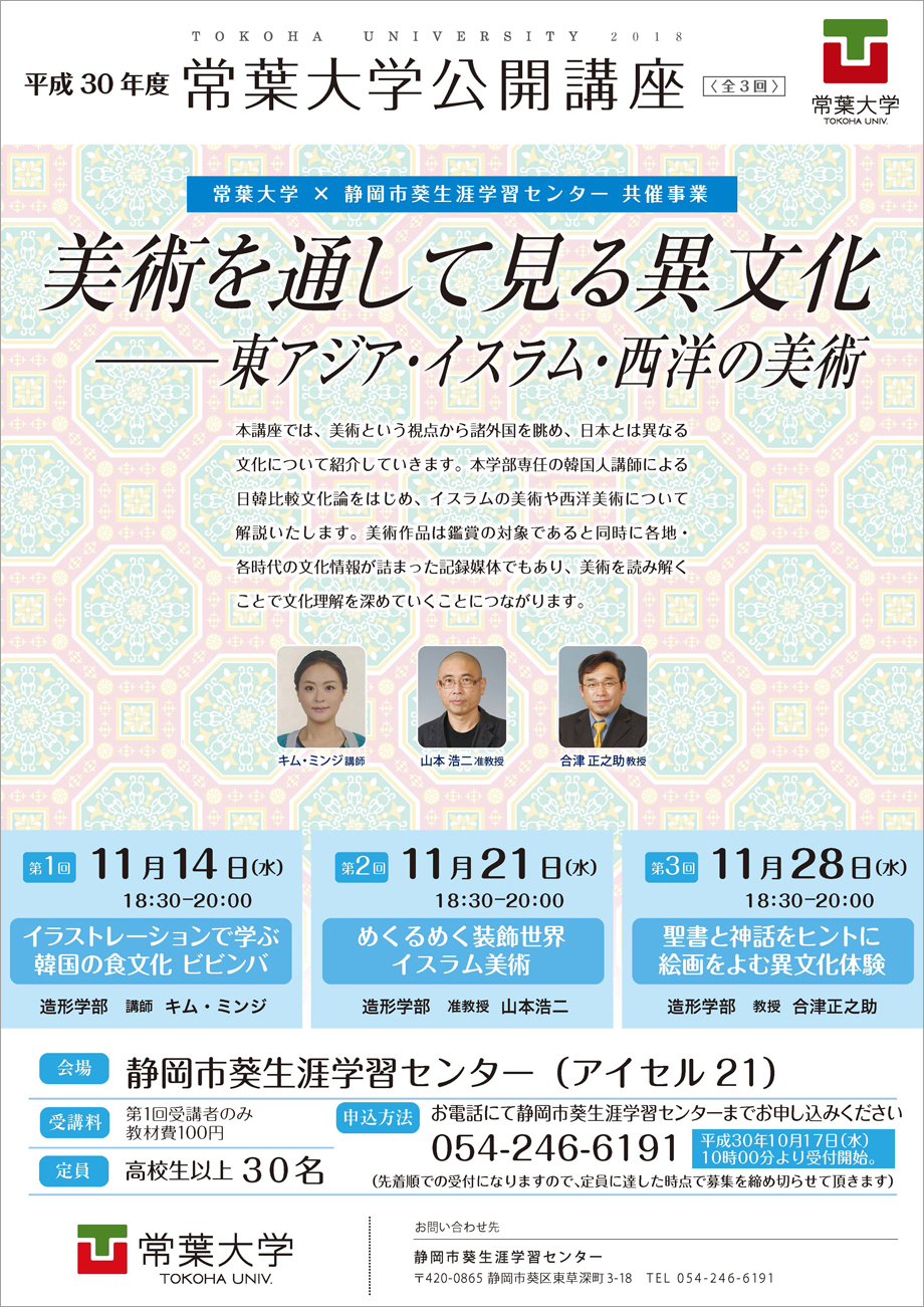 常葉大学造形学部の公開講座を、11月14日(水曜日)より3回シリーズで開催します。