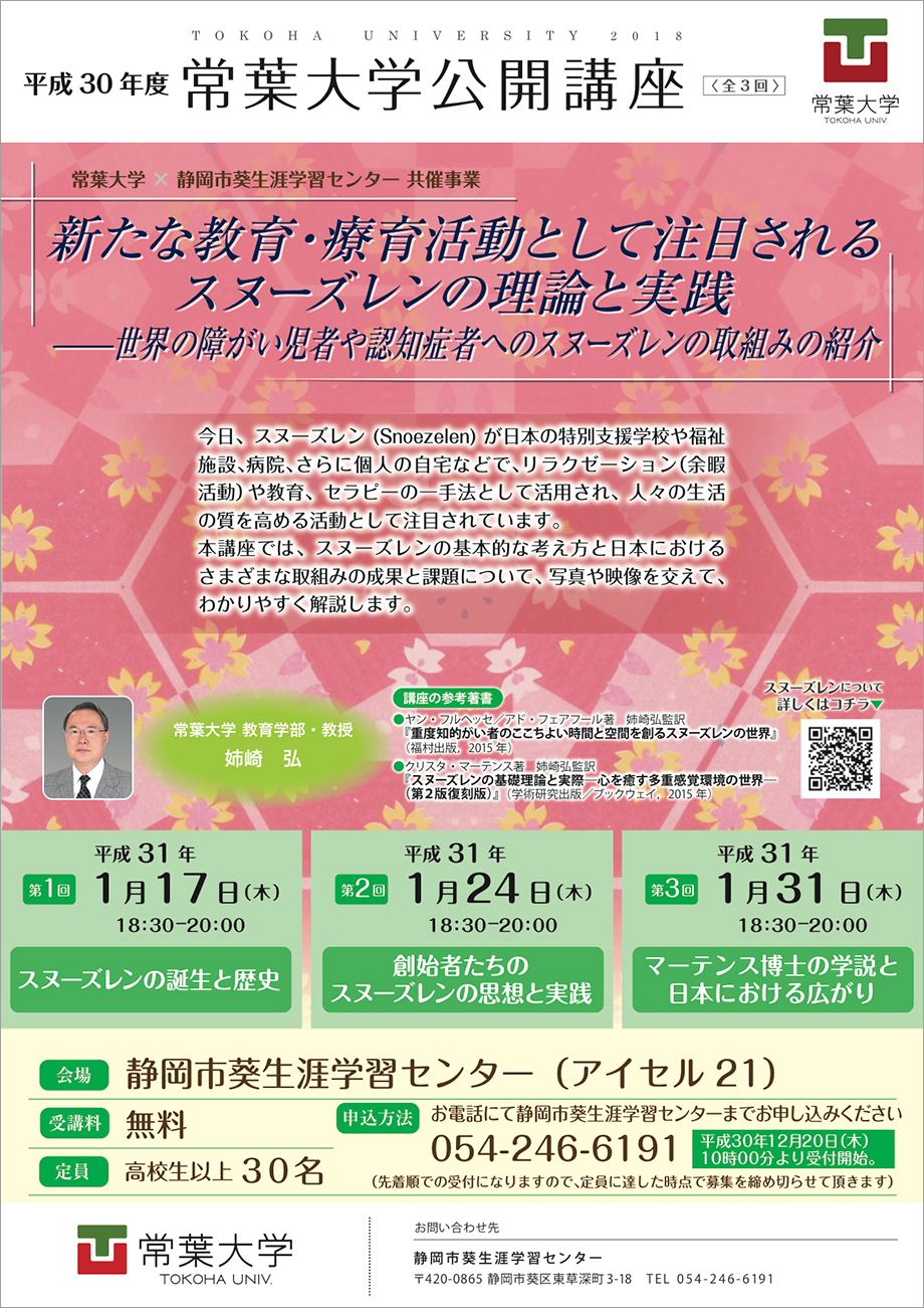 常葉大学教育学部の公開講座を、2019年1月17日(木曜日)より3回シリーズで開催します。