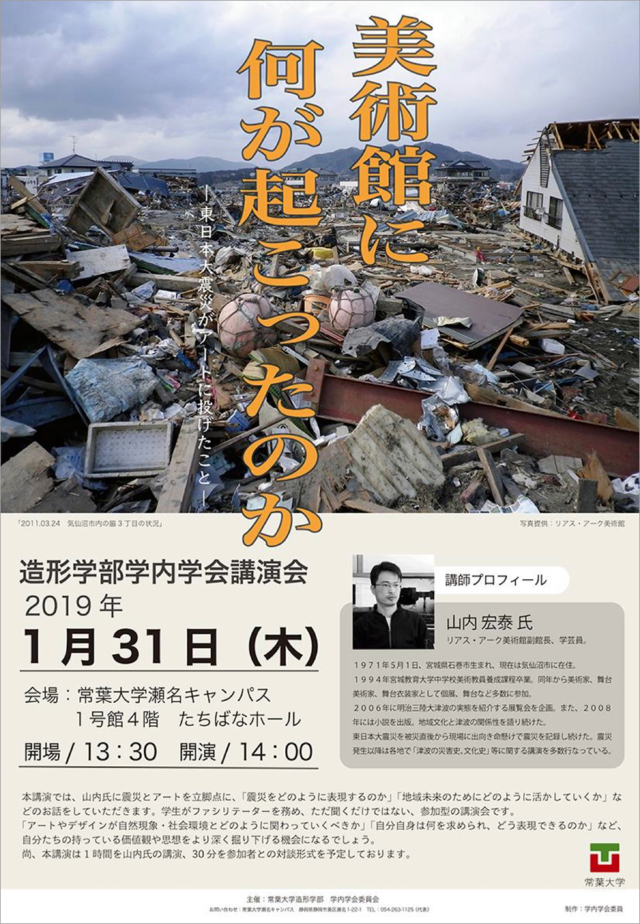 ■日 時:2019年1月31日(木) 13:30開場/14:00開演 ■会 場:常葉大学 瀬名キャンパス 1号館4階 たちばなホール ■内 容: 講演会(山内氏の講演1時間の後、参加者との対談形式30分) 『美術館に何が起こったのか』 ~東日本大震災がアートに投げたこと~ 講師:リアス・アーク美術館(副館長)山内宏泰氏 山内副館長には、震災とアートを立脚点に、「震災をどのように表現するのか」「地域未来のためにどのように活かしていくか」などのお話をしていただきます。 講演後のディスカッションでは、学生がファシリテーターを務め、来場者参加型の講演会を予定しております。 ■その他:一般参加自由、申込み不要。(参加費無料) |