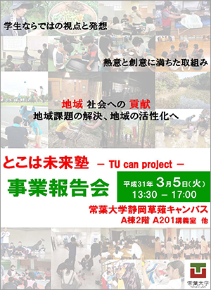本学では、大学が地域社会への貢献を果たすとともに、学生の若い力を地域の活性化に結び付けることを目的とした事業「とこは未来塾」を本年度より創設しました。これは、学生ならではのユニークな「視点と発想」を持ち、「熱意と創意」に満ちた学生の自主的・自発的な取組に対して、大学が教員アドバイザーによる助言や活動資金の援助などの支援をおこなうものです。
