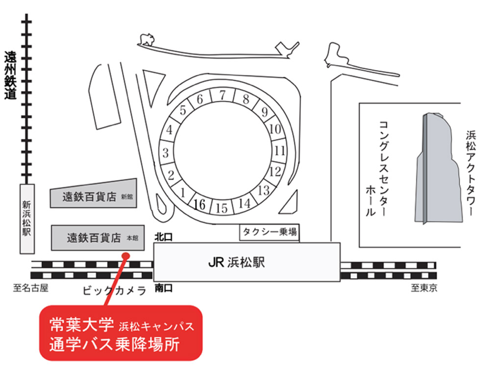 | 交通について | ①大学構内への車乗り入れと駐車場利用(無料)が可能です。 ②当日、JR浜松駅10時00分発のスクールバスをご利用いただけます(参観の方は先着40名まで)。 |