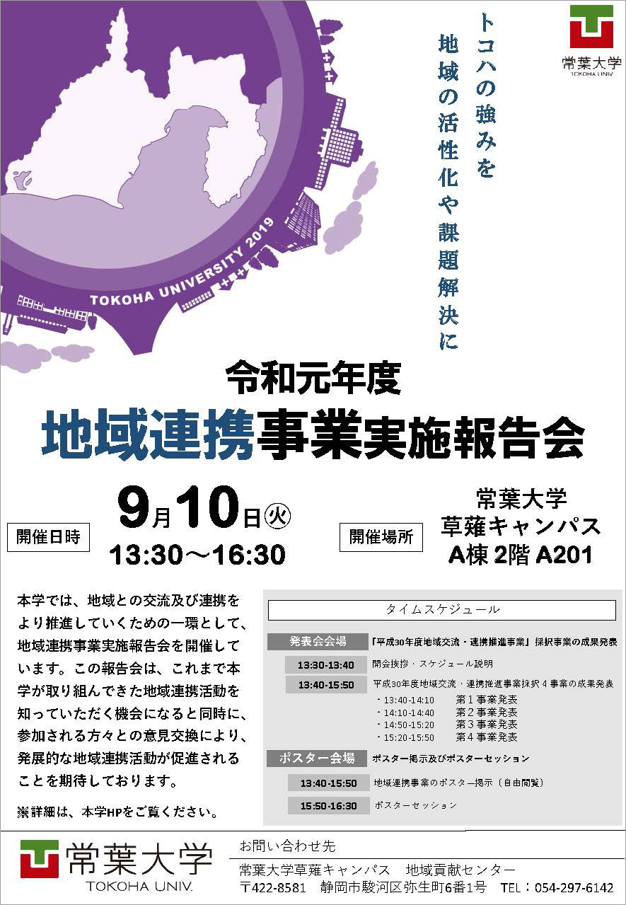地域との交流及び連携推進を目的とした「地域連携事業実施報告会」を9月10日(火曜日)に開催します。本学教員が昨年度に地域と取り組んだ連携事業について発表すると同時に、教員や学生による地域連携活動の成果をポスターで報告します。