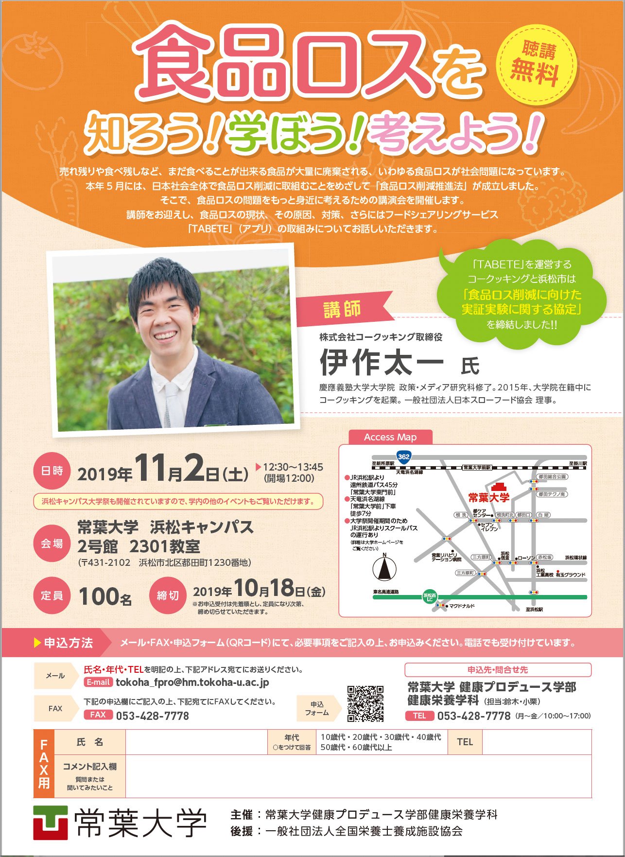 そこで、食品ロスの問題をもっと身近に考えるための講演会を開催します。講師に株式会社コークッキング取締役の伊作太一氏をお迎えし、食品ロスの現状、その原因、対策、さらにはフードシェアリングサービス「TABETE」(アプリ)の取組みについてお話しいただきます。