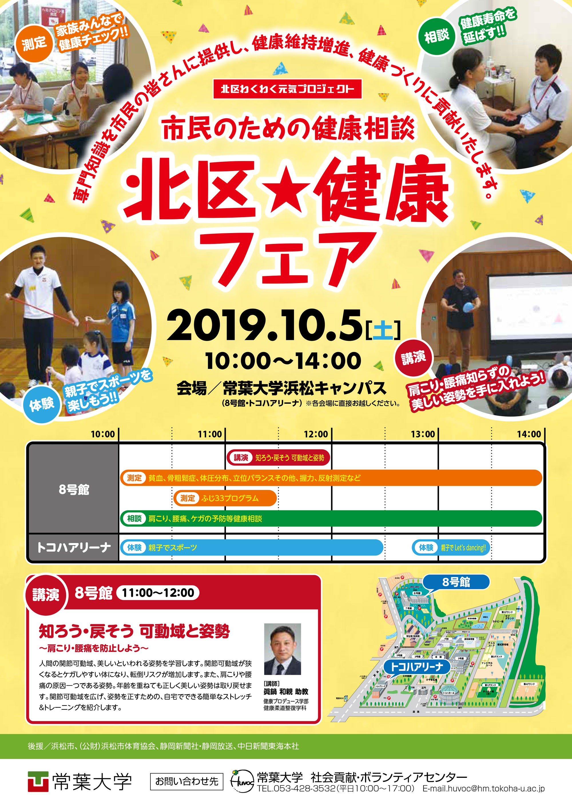 浜松市北区わくわく元気プロジェクトの「市民のための健康相談 北区★健康フェア」が、10月5日(土曜日)に常葉大学浜松キャンパスで開催されます。