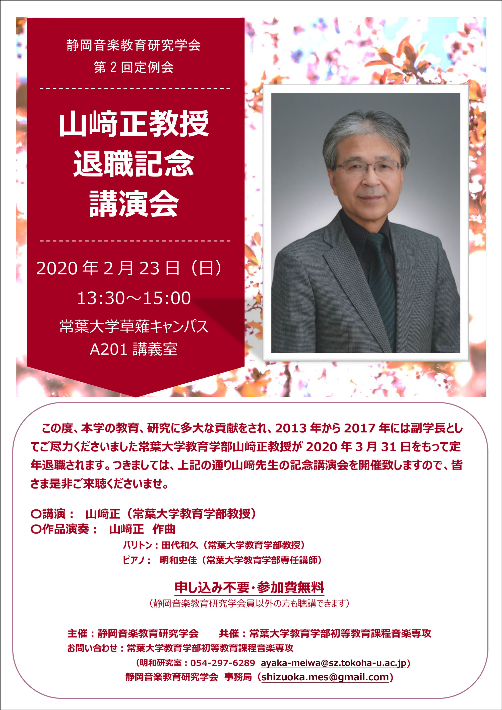 | 内容 | 講演: 山﨑正(常葉大学教育学部教授) 作品演奏: 山﨑正 作曲 バリトン:田代和久(常葉大学教育学部教授) ピアノ: 明和史佳(常葉大学教育学部専任講師) |